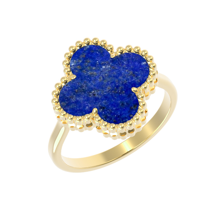 Главным элементом изделия является лазурит глубокого синего цвета, ограненный в узнаваемую и символичную форму клевера. Контур вставки аккуратно обрамлен фактурным золотым ободком, напоминающим ряд миниатюрных бусин, что придает украшению особую выразительность и визуальный объем. Использование одной крупной вставки делает акцент на благородстве камня и безупречности линий.