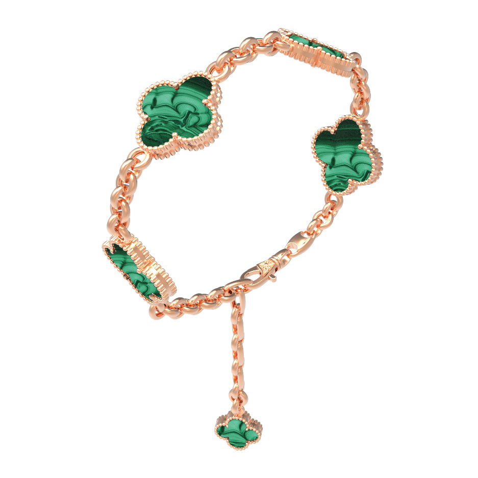 Выберите украшение, которое будет радовать вас долгие годы. Этот браслет из красного золота с малахитом — прекрасный выбор для подарка близкому человеку или ценное пополнение собственной коллекции ювелирных изделий. Качественные материалы и классический дизайн в форме клевера делают это украшение актуальным вне времени и модных тенденций.