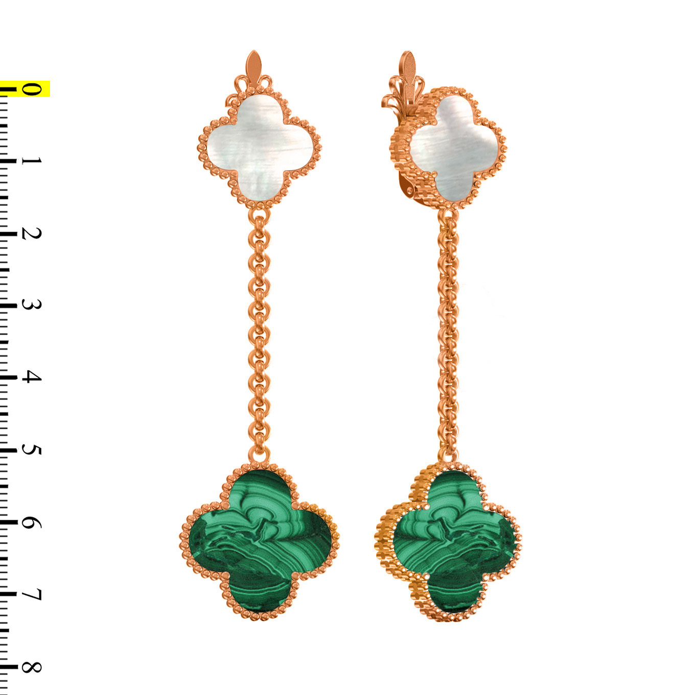 Конструкция серег представляет собой длинные цепочки, соединяющие два элемента в форме клевера. Верхняя часть инкрустирована нежным перламутром с его характерным перламутровым переливом, а нижняя, более массивная часть, украшена насыщенным зеленым малахитом с его уникальным природным рисунком. Всего в изделии использовано 2 вставки, которые создают эффектный контраст между спокойным сиянием перламутра и глубоким цветом малахита.