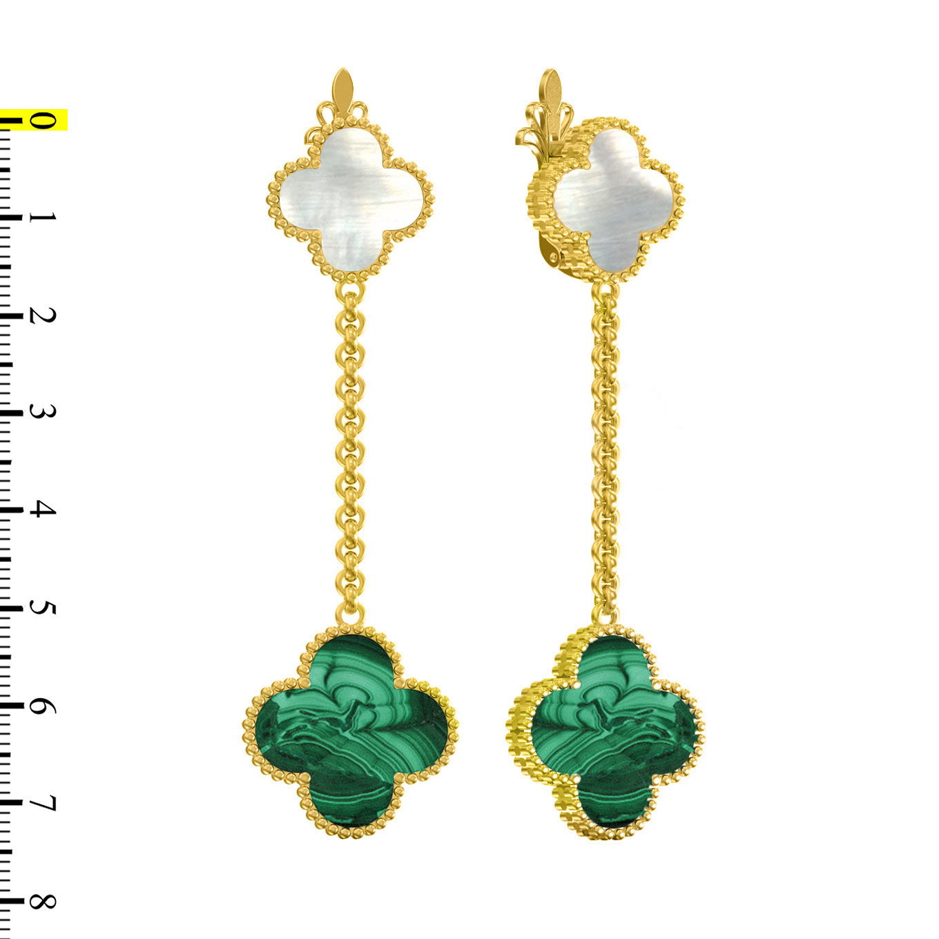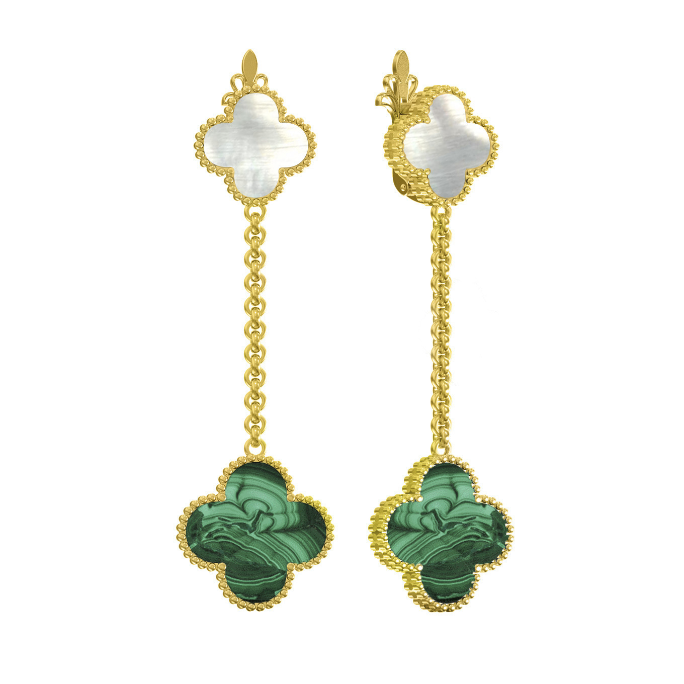 Элегантные серьги из лимонного золота 585 пробы из коллекции De Luxe — Клевер станут воплощением утонченного стиля в вашем образе. Дизайнерское решение в форме клевера объединяет в себе два знаковых ювелирных материала — благородный малахит зеленого цвета и нежный перламутр, создавая гармоничный контраст. Использование двух вставок в каждом изделии придает украшению особую глубину и выразительность.
