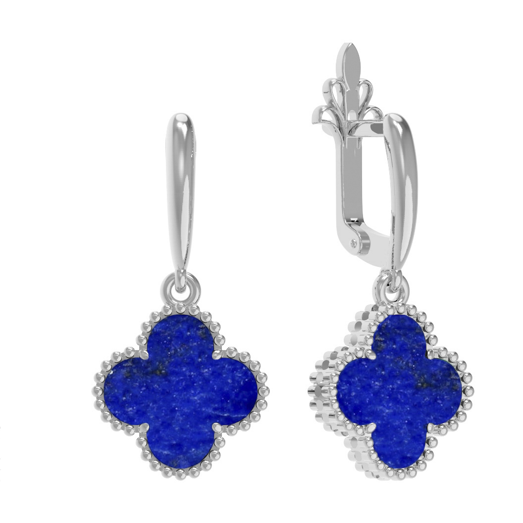 Элегантные серьги из белого золота 585 пробы станут воплощением изысканности и утонченного вкуса. Дизайн в форме клевера — это классика, которая никогда не теряет своей актуальности, придавая образу нотку гармонии и притягательности. Глубокий синий цвет вставок из натурального лазурита эффектно контрастирует с холодным блеском драгоценного металла, создавая притягательный визуальный акцент.