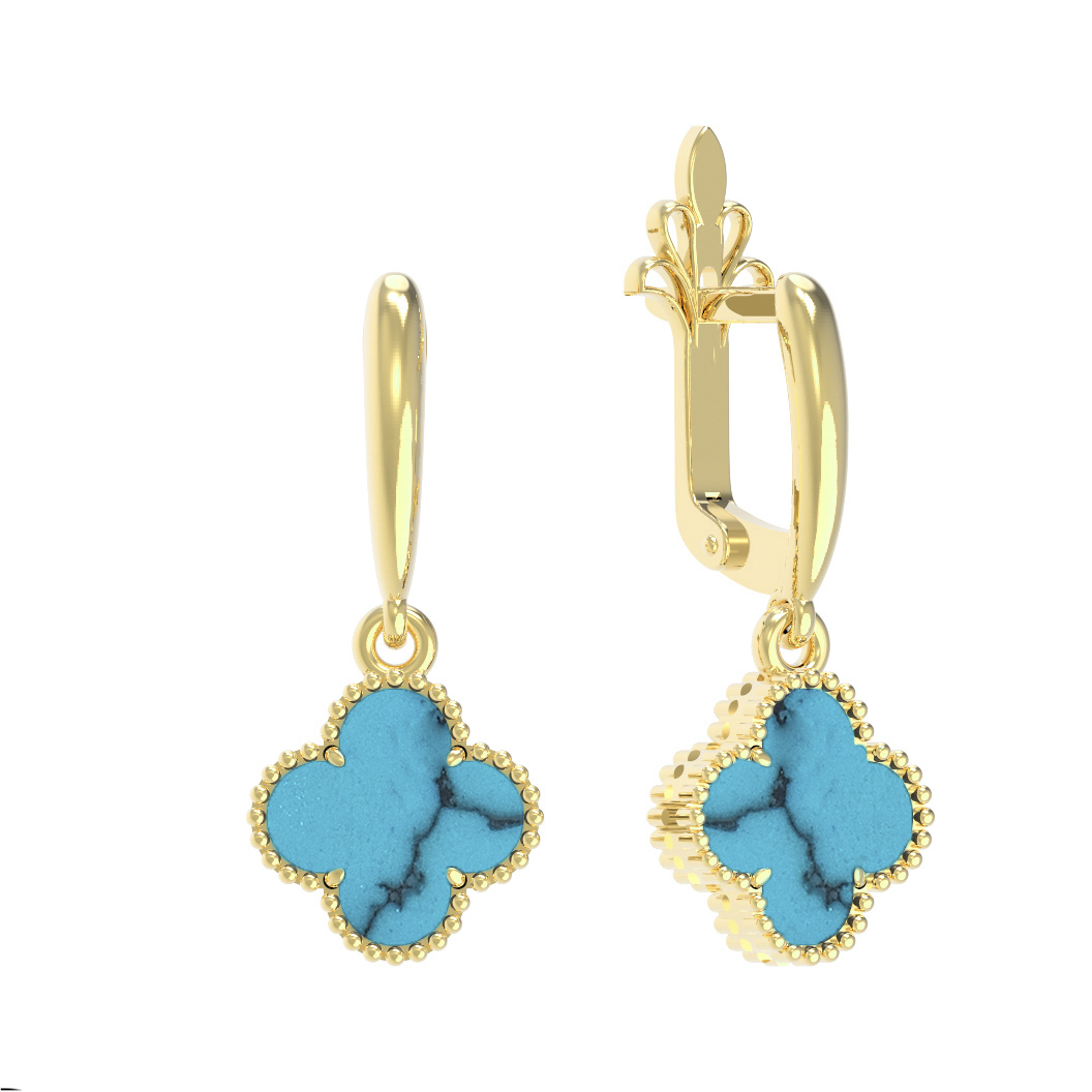 Центральным элементом дизайна выступает узнаваемый и символичный мотив — клевер. Две вставки из натуральной бирюзы бирюзового цвета, обрамленные филигранной золотой оправой, притягивают взгляд своей природной красотой и глубиной оттенка. Лаконичное исполнение позволяет серьгам стать гармоничным дополнением как повседневного делового образа, так и роскошного вечернего наряда.