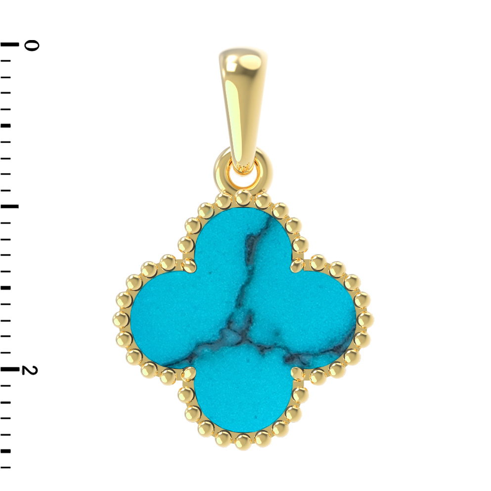 Элегантная подвеска из лимонного золота 585 пробы — это воплощение утонченности и стиля. Дизайн в форме клевера придает украшению особую символичность, делая его не просто аксессуаром, а значимым элементом вашего образа. Лимонный оттенок драгоценного металла гармонично сочетается с насыщенной бирюзой, которая является главной вставкой изделия. Яркий бирюзовый цвет камня эффектно выделяется на фоне золотого блеска, привлекая внимание к каждой детали.