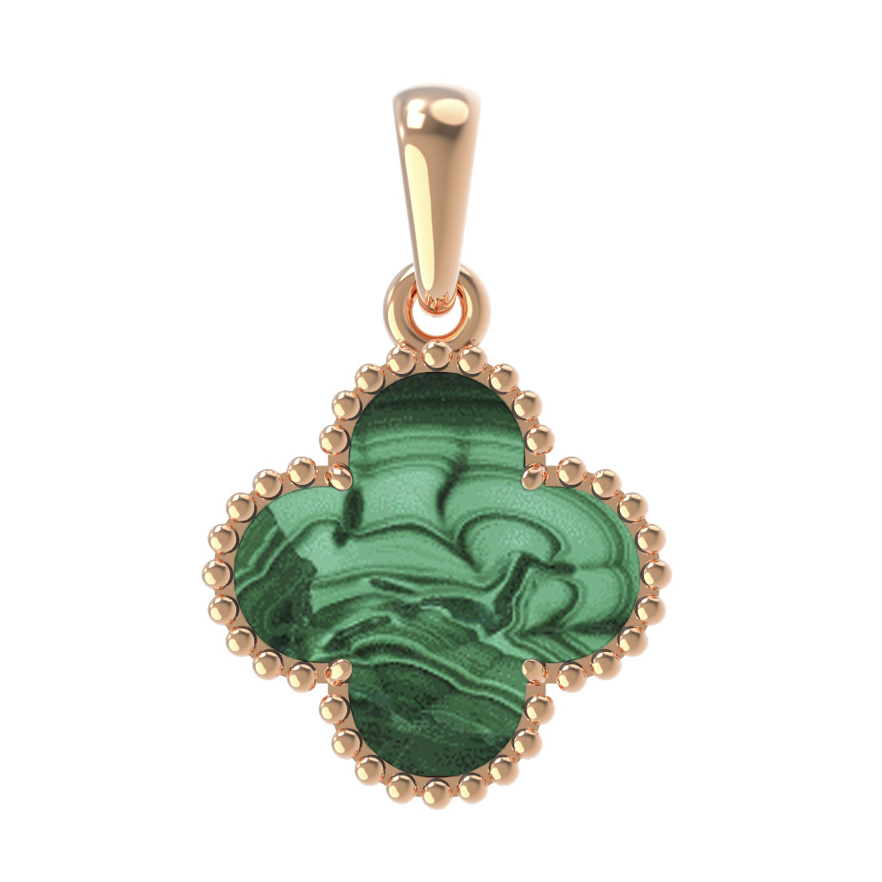 Элегантная подвеска из красного золота 585 пробы станет утонченным акцентом вашего образа. Дизайн изделия выполнен в форме культового клевера, который неизменно ассоциируется с удачей и гармонией. Центральным элементом украшения выступает натуральный малахит глубокого зелёного цвета. Единственная вставка, обрамленная изящной золотой каймой, притягивает взгляд своей неповторимой природной текстурой и насыщенным оттенком.
