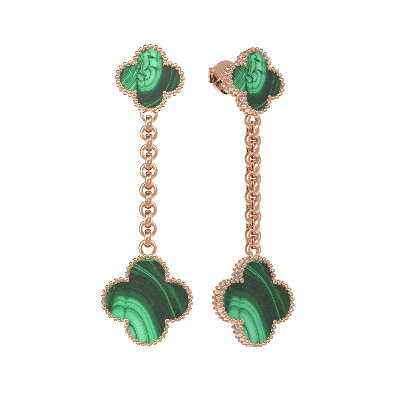 Элегантные серьги из красного золота 585 пробы — воплощение утонченного стиля и природной красоты. Изделие из коллекции De Luxe — Клевер притягивает взгляд своим изысканным дизайном в форме клевера, который символизирует удачу и благополучие. Глубокий, насыщенный зелёный цвет малахита великолепно контрастирует с теплым блеском красного золота, создавая гармоничный и выразительный образ.