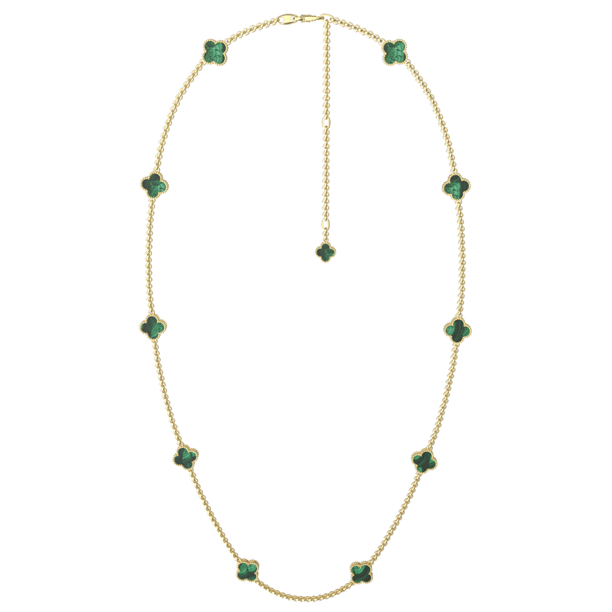 Изысканное колье из лимонного золота 585 пробы станет утонченным дополнением вашего образа, подчеркивая статус и безупречный вкус. Украшение из коллекции De Luxe — Клевер выполнено в узнаваемом дизайне «Клевер», который давно стал классикой ювелирного искусства. Центральными элементами композиции выступают 11 вставок из натурального малахита глубокого зеленого цвета. Природный узор минерала гармонично сочетается с теплым блеском благородного металла.