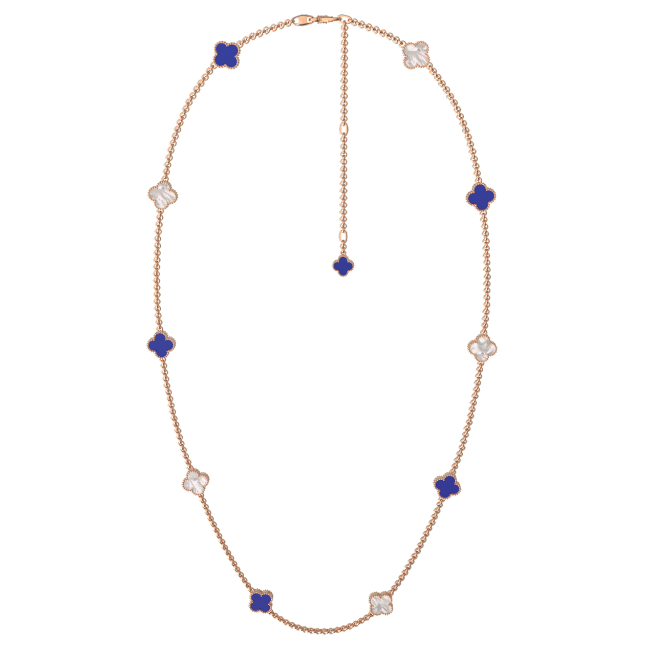 Особую выразительность колье придают натуральные вставки: глубокий синий лазурит и нежный перламутр. Контраст между насыщенным цветом камней и мягким сиянием перламутровых пластин делает это ювелирное изделие по-настоящему притягательным. Красное золото подчеркивает теплоту и благородство материалов, позволяя украшению гармонично смотреться как с повседневной одеждой, так и с вечерним нарядом.