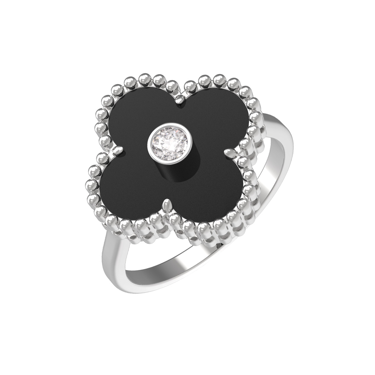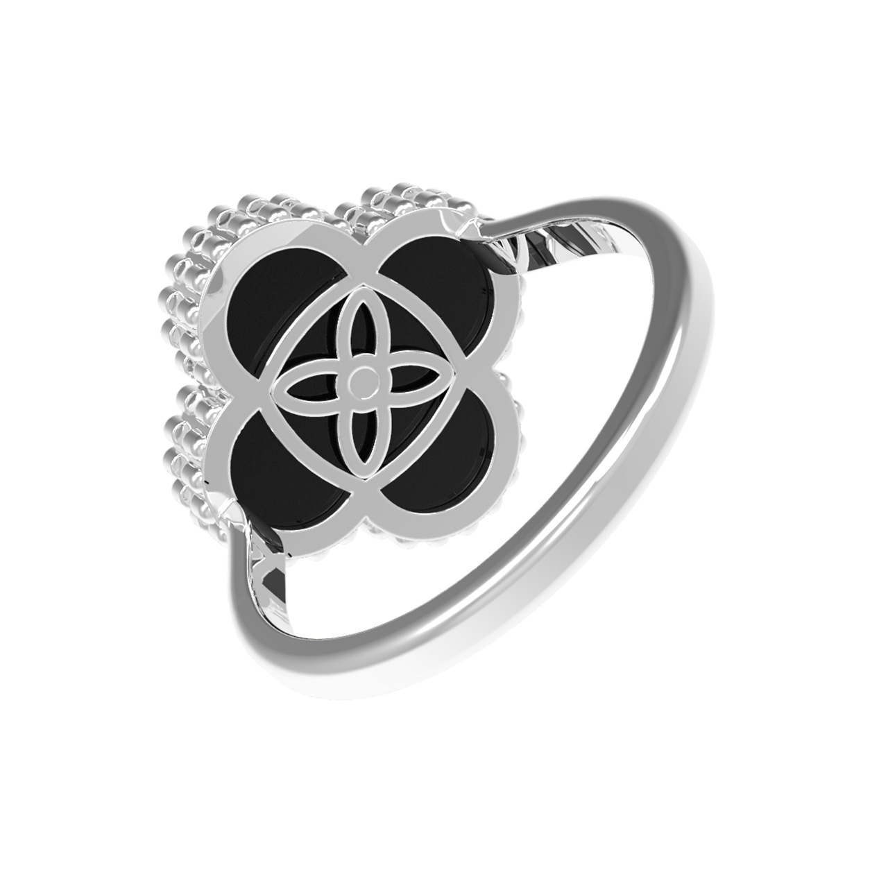 Кольцо из белого золота 585 пробы из коллекции De Luxe — Клевер станет изысканным акцентом вашего образа. Это стильное украшение в дизайне Клевер отличается элегантным сочетанием благородных материалов и классических форм. Центральный элемент декора выполнен в форме четырехлистника, символизирующего удачу и гармонию. Основу композиции составляет глубокий черный оникс, который эффектно контрастирует с холодным блеском металла.