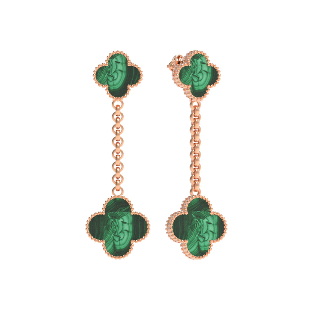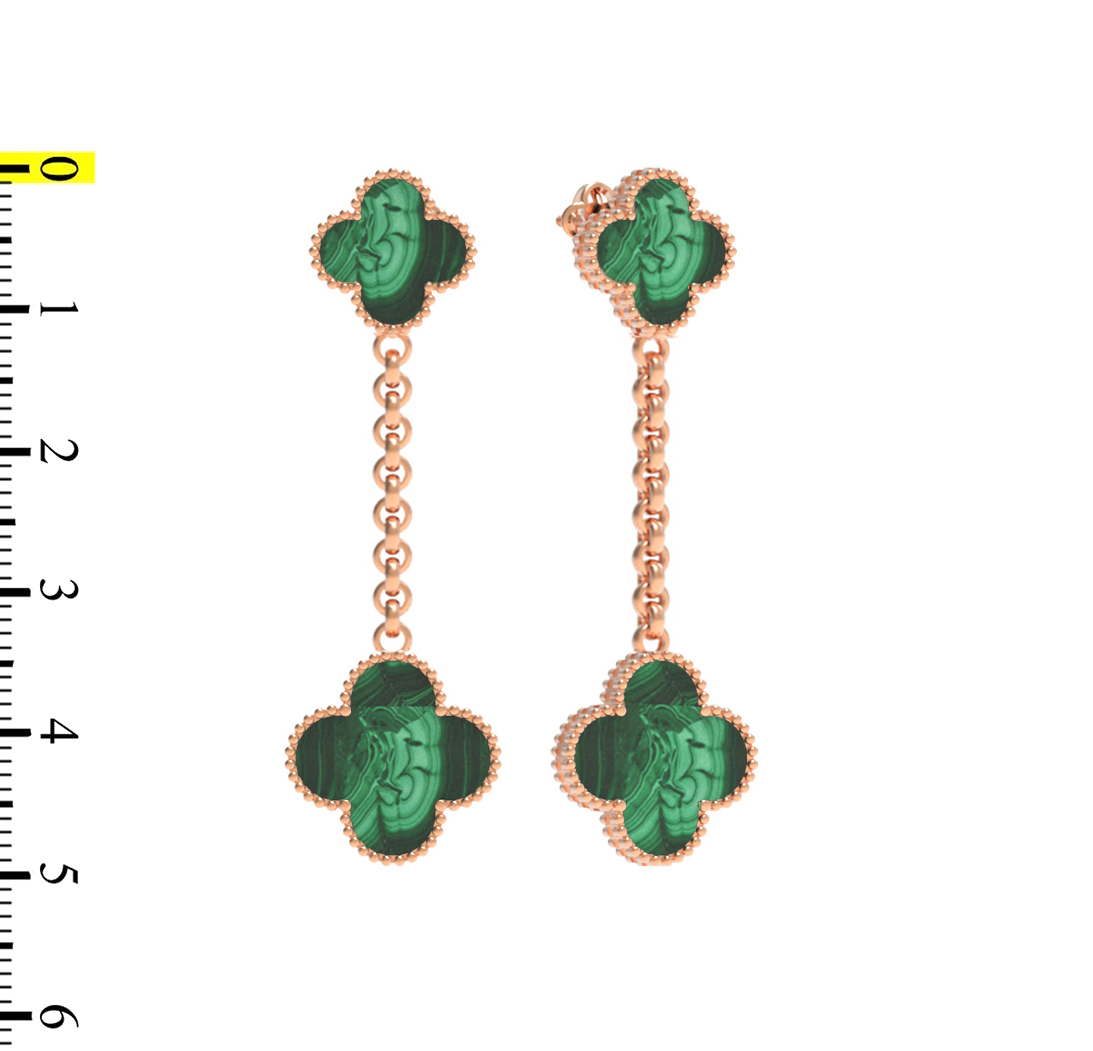 В данных серьгах гармонично сочетаются классические традиции ювелирного искусства и современные тенденции. Всего в украшении использованы 4 вставки из натурального малахита, которые красиво играют на свету. Благодаря продуманному дизайну, серьги станут прекрасным дополнением как для повседневного, так и для вечернего выхода. Это украшение универсально: оно создано для женщин и для мужчин, предпочитающих премиальные аксессуары.