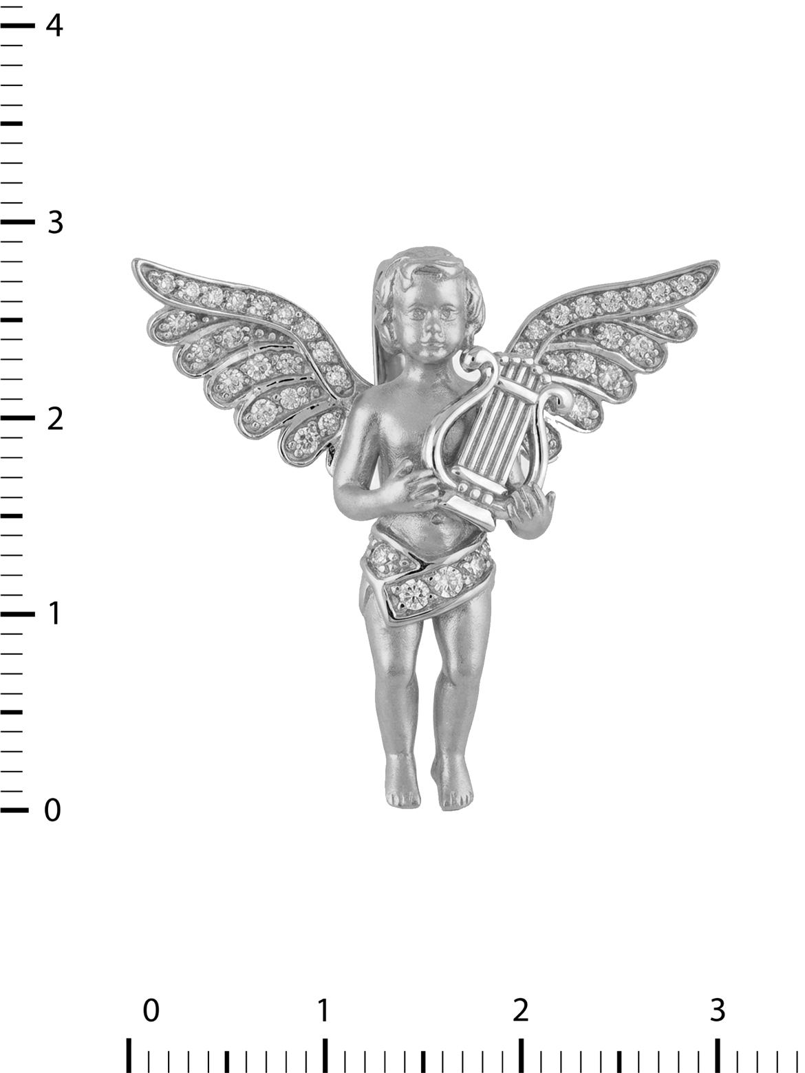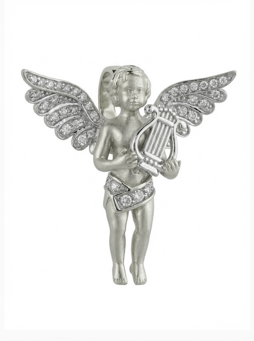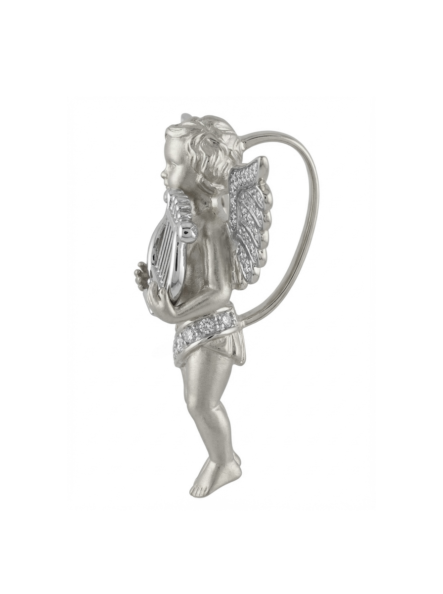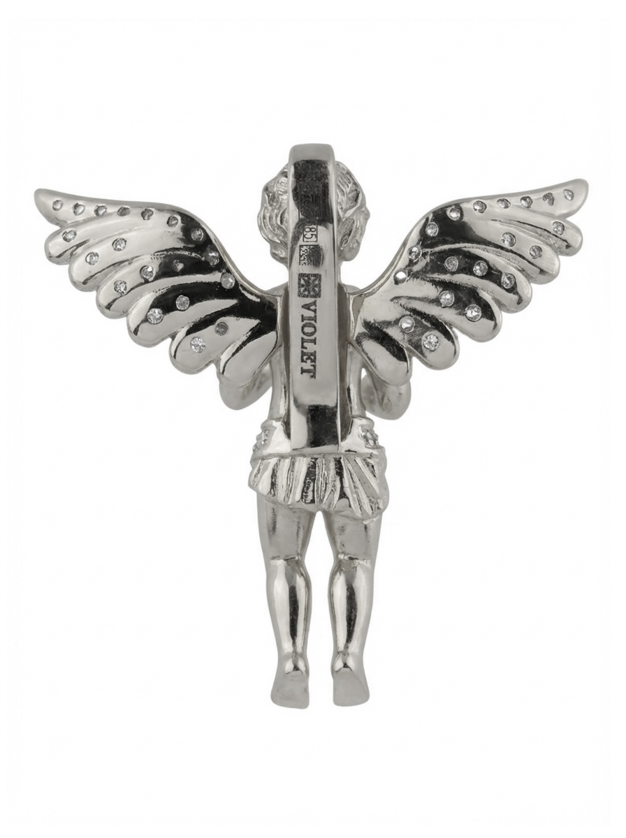Особую выразительность подвеске придают 45 сверкающих вставок из фианита. Белые камни круглой формы расположены на крыльях ангела и его набедренной повязке, создавая эффектное сияние при каждом движении. Точечная инкрустация добавляет украшению глубину и делает его визуально более объемным и живым. Такое ювелирное решение позволяет аксессуару притягивать взгляды и служить акцентным дополнением образа.