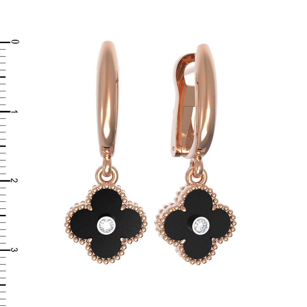 Центральным элементом композиции выступает выразительный оникс черного цвета, который великолепно контрастирует с теплым блеском красного золота. В центре каждой вставки расположен сверкающий бриллиант круглой формы, добавляющий украшению роскошного сияния. Всего в изделии использовано 4 вставки, объединяющие в себе глубину черного оникса и чистоту белого бриллианта.