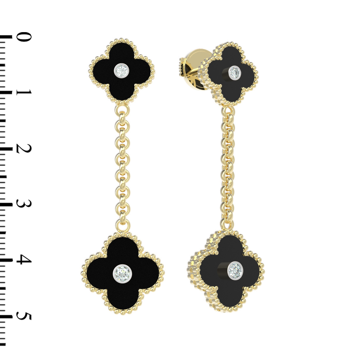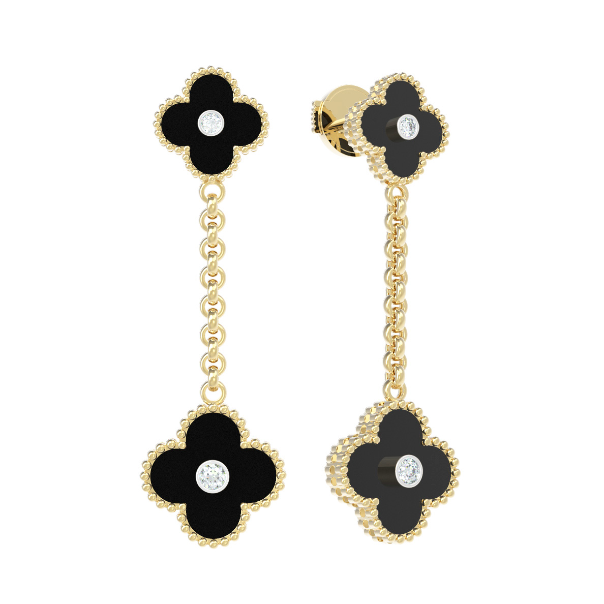 В центре каждого из восьми элементов композиции сияют бриллианты круглой огранки, которые притягивают взгляд своим неповторимым блеском. Основным акцентом выступает глубокий черный оникс, создающий выразительный контраст с лимонным золотом. Такая игра фактур и цветов делает серьги универсальным аксессуаром, который прекрасно дополнит как повседневный образ, так и роскошный вечерний наряд.