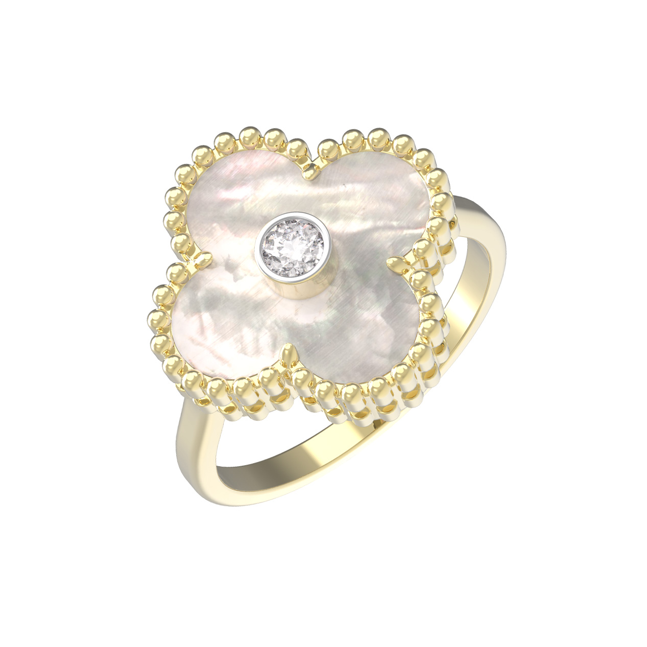 Кольцо из лимонного золота 585 пробы — утонченное украшение, которое станет акцентом вашего образа. Дизайн изделия выполнен в форме клевера, символизирующего удачу и гармонию. Основу декоративной части составляет нежный перламутр, мягкое сияние которого придает кольцу особый шарм. В самом центре композиции расположена одна вставка — бриллиант круглой огранки, который эффектно контрастирует с перламутром белого цвета и добавляет благородного блеска.