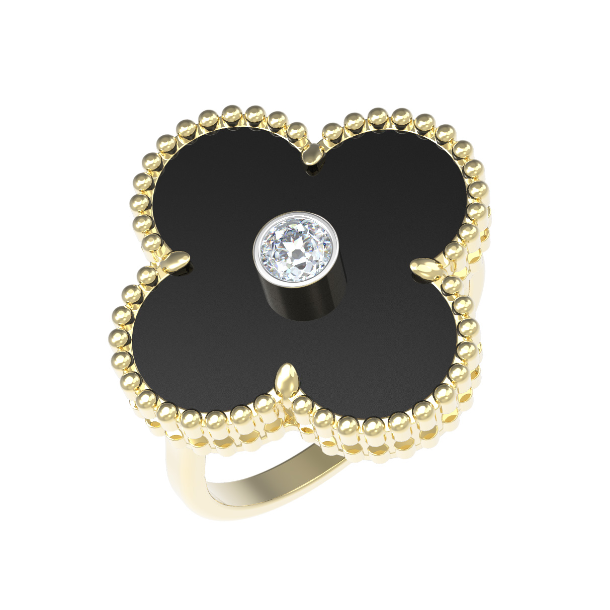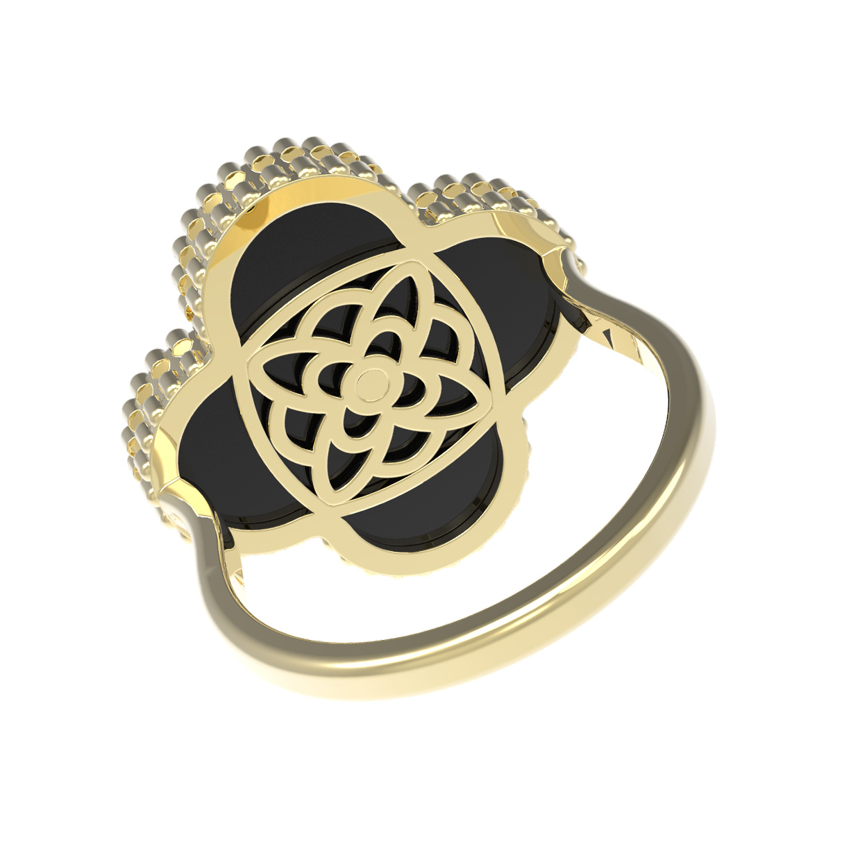 Кольцо из коллекции De Luxe — Клевер воплощает безупречный стиль и эстетику, объединяя в себе роскошь благородных металлов и глубину натуральных камней. Изделие выполнено из лимонного золота 585 пробы, чей теплый и солнечный оттенок идеально дополняет контрастное сочетание вставок. Дизайн в форме клевера, украшенный по контуру изящным зернением, делает это кольцо центральным акцентом вашего образа.