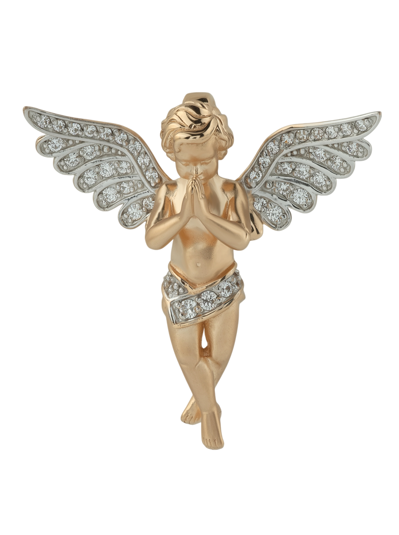 Изящная подвеска из золота с фианитом — воплощение нежности и утонченного мастерства ювелиров. Изделие выполнено из красного золота 585 пробы, которое придает украшению теплый, благородный оттенок. Дизайн украшения, представляющий собой фигурку купидона, становится центральным элементом образа, привлекая внимание своей детализацией и символизмом.