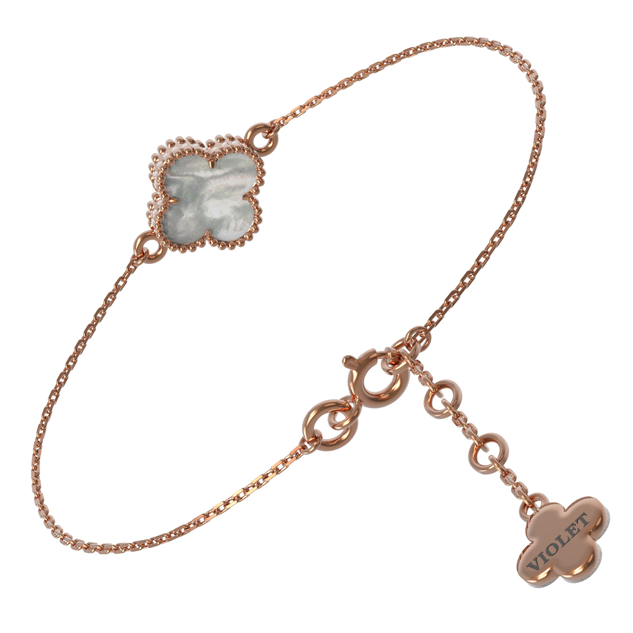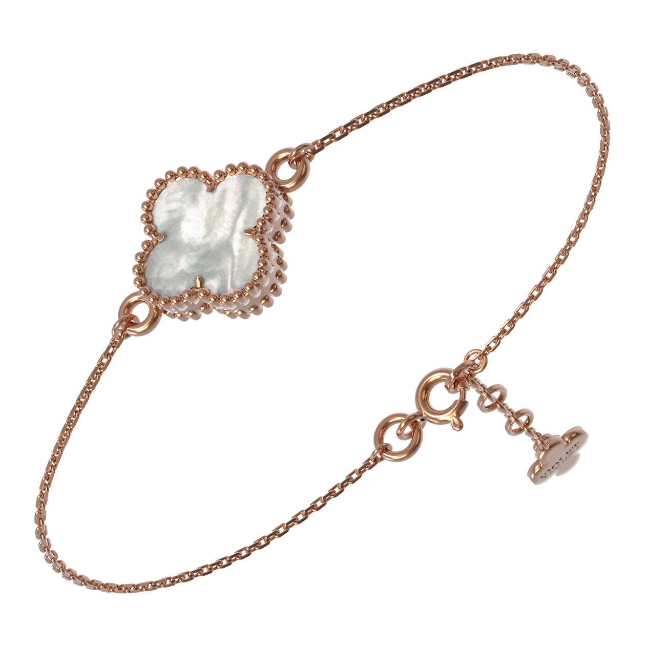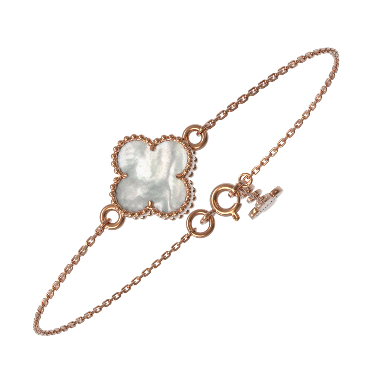 Изысканный браслет из красного золота 585 пробы станет утонченным акцентом вашего образа. Дизайн украшения, вдохновленный символом удачи в виде клевера, воплощает в себе гармонию классики и современной эстетики. Центральным элементом композиции является вставка из натурального перламутра, которая притягивает взгляд мягким, переливающимся светом. Теплый оттенок металла идеально сочетается с нежным сиянием перламутровой вставки, создавая благородный и запоминающийся дуэт.