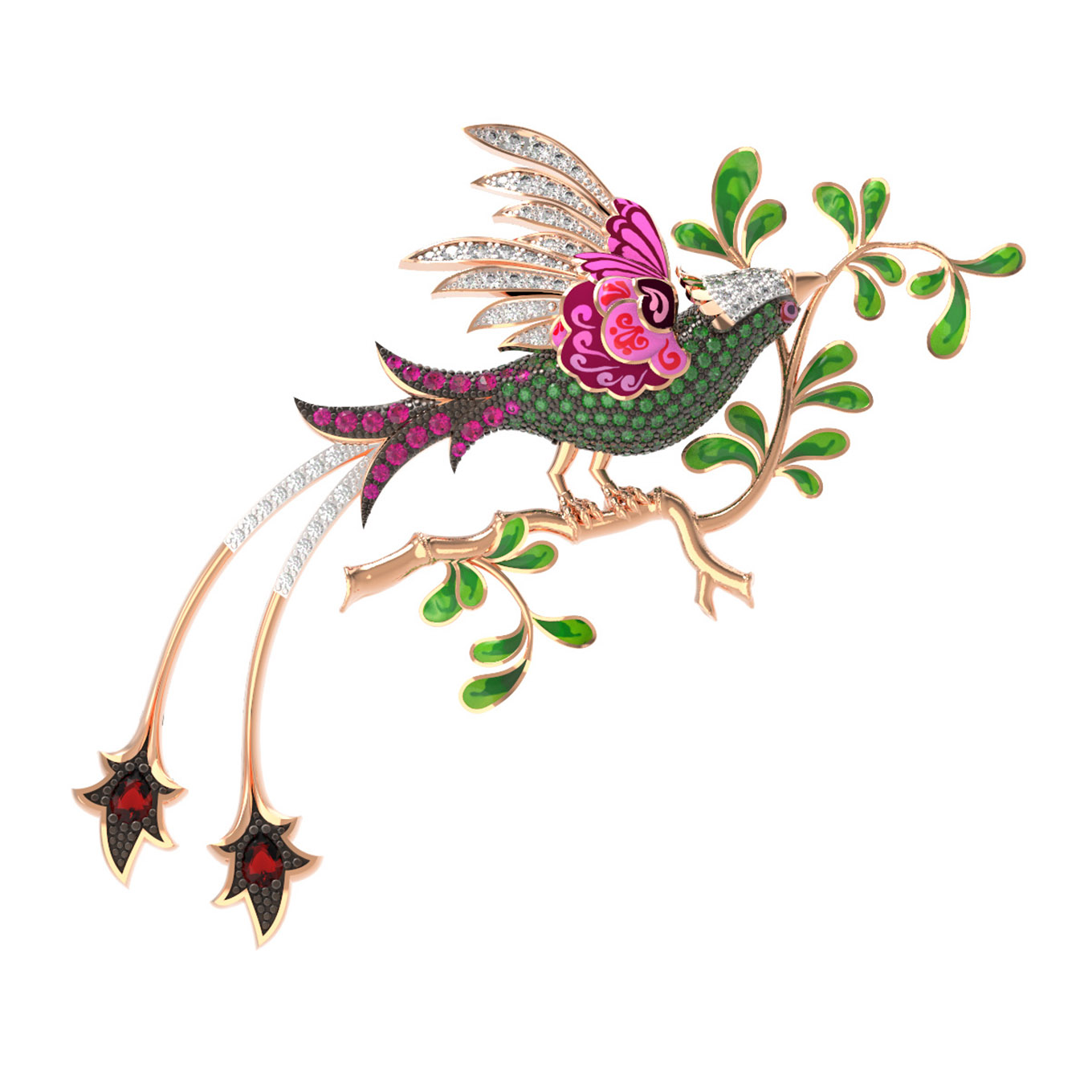 В декоре броши гармонично сочетаются несколько видов вставок. Общее количество камней составляет 167 штук. Сияние граната красного цвета эффектно контрастирует с блеском фианитов, а изящные вставки зеленого цвета добавляют композиции природной свежести. Камни имеют классическую форму круга и изысканную форму груши. Особый шарм изделию придает художественная эмаль, проработанная до мельчайших деталей.