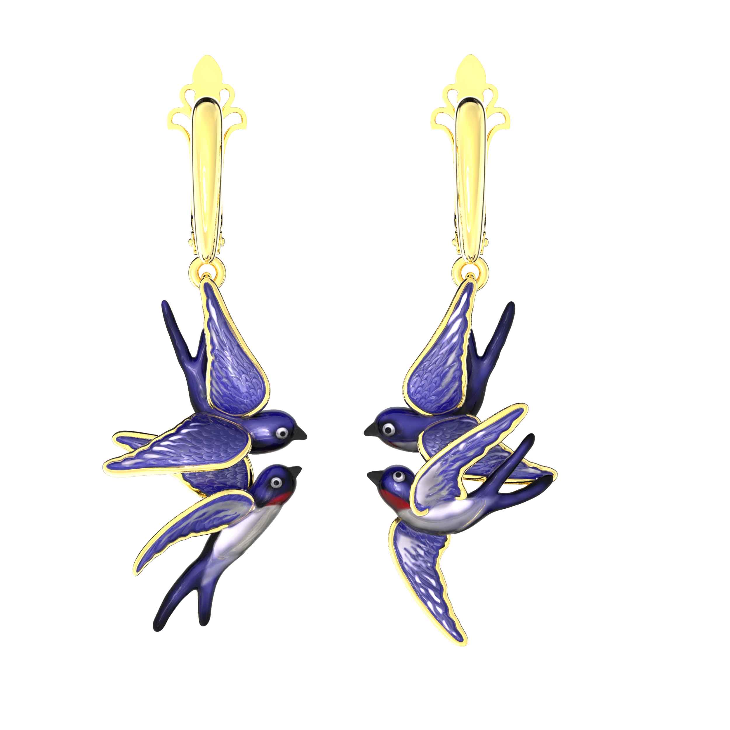 Особую художественную ценность модели придает вставка из эмали. Разноцветный декор на крыльях птиц подчеркивает тонкую проработку формы и создает приятный контраст с золотой основой. Глубокие и насыщенные оттенки эмали долго сохраняют свою яркость, радуя владельца своим первозданным видом. Данная модель универсальна: эти серьги подходят для женщин и мужчин, ценящих авторские украшения со смыслом.
