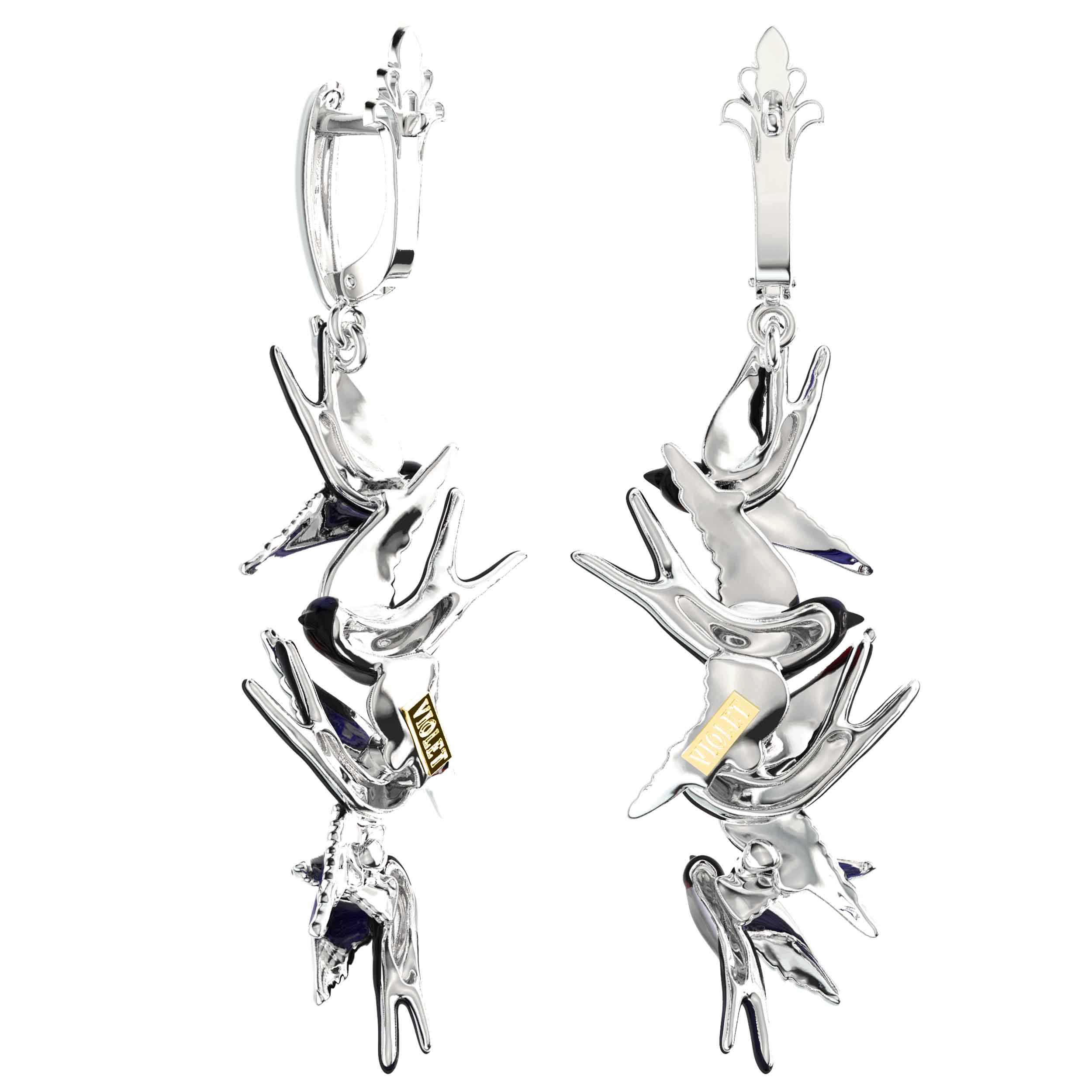 Серьги из белого золота 585 пробы из коллекции De Luxe — Ласточки — это воплощение утонченности и свободы. Дизайн изделия вдохновлен грацией птиц: искусные подвески выполнены в форме парящих ласточек, которые создают ощущение легкости и динамики при каждом движении. Холодный блеск белого металла гармонично сочетается с выразительной художественной эмалью, придающей украшению глубину и особую эстетику. Разноцветные вставки на эмали подчеркивают детали оперения, делая каждую пару уникальной.