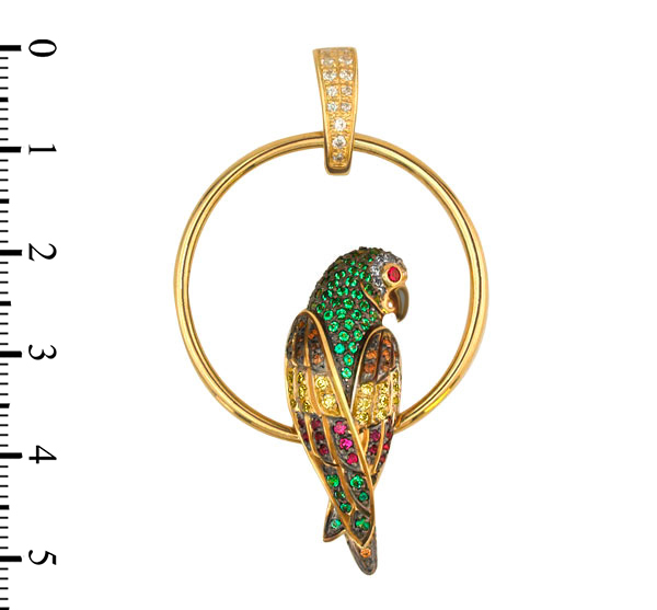 Яркая и выразительная подвеска из лимонного золота 585 пробы станет центральным акцентом вашего образа. Дизайн украшения, вдохновленный экзотической тематикой коллекции De Luxe — Попугаи, отличается необычной формой и мастерской проработкой деталей. В центре композиции расположена фигура попугая, выполненная с ювелирной точностью, которая гармонично вписана в лаконичный золотой круг.