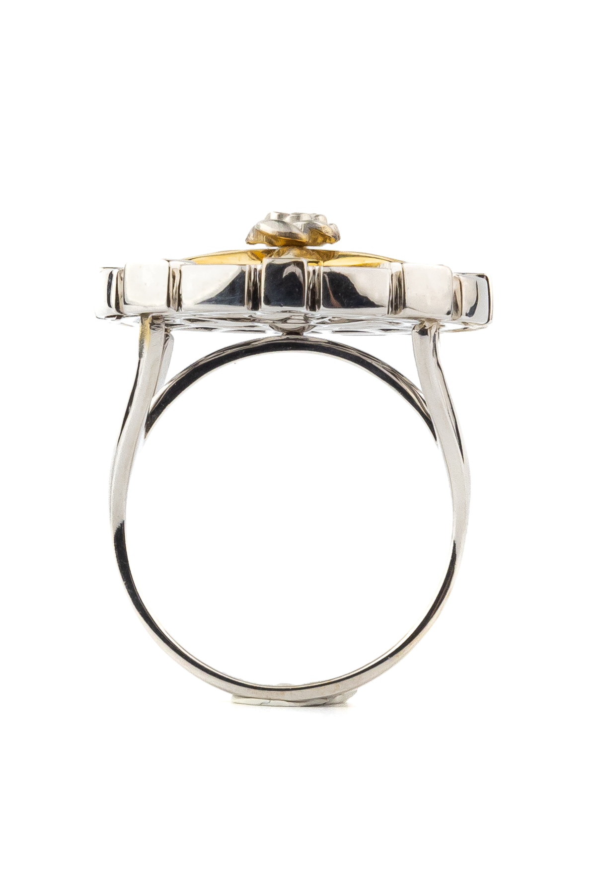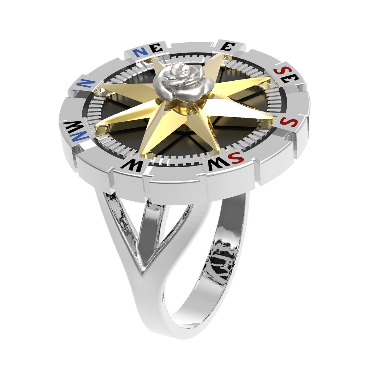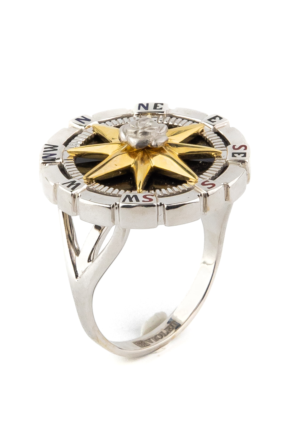 Внешний вид кольца напоминает стилизованный компас или розу ветров, где круглая форма вставки гармонично сочетается с геометрическими линиями. Это универсальное изделие подходит как для женщин, так и для мужчин, подчеркивая индивидуальность и вкус владельца. Ювелирная композиция выглядит выразительно и статусно, позволяя использовать украшение как самостоятельный аксессуар или в сочетании с другими изделиями в качестве комплекта.