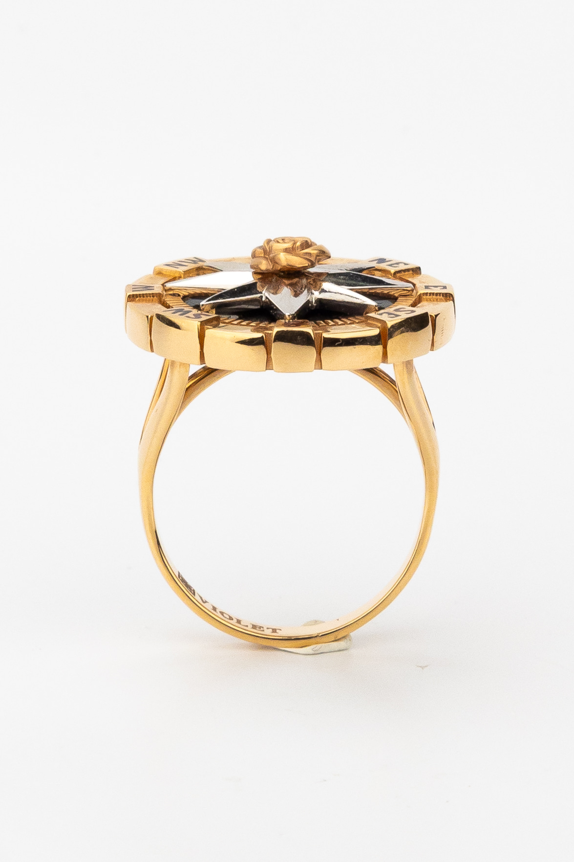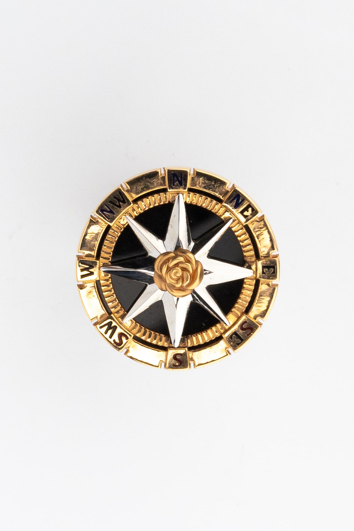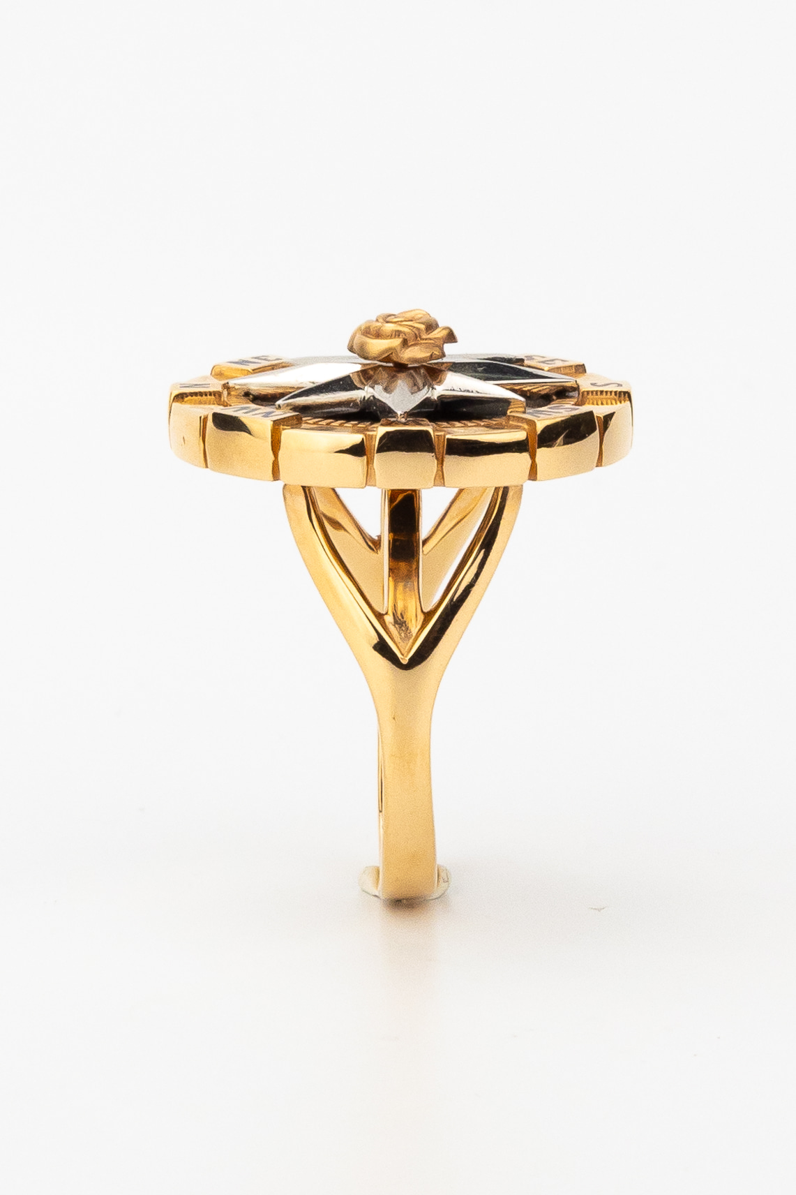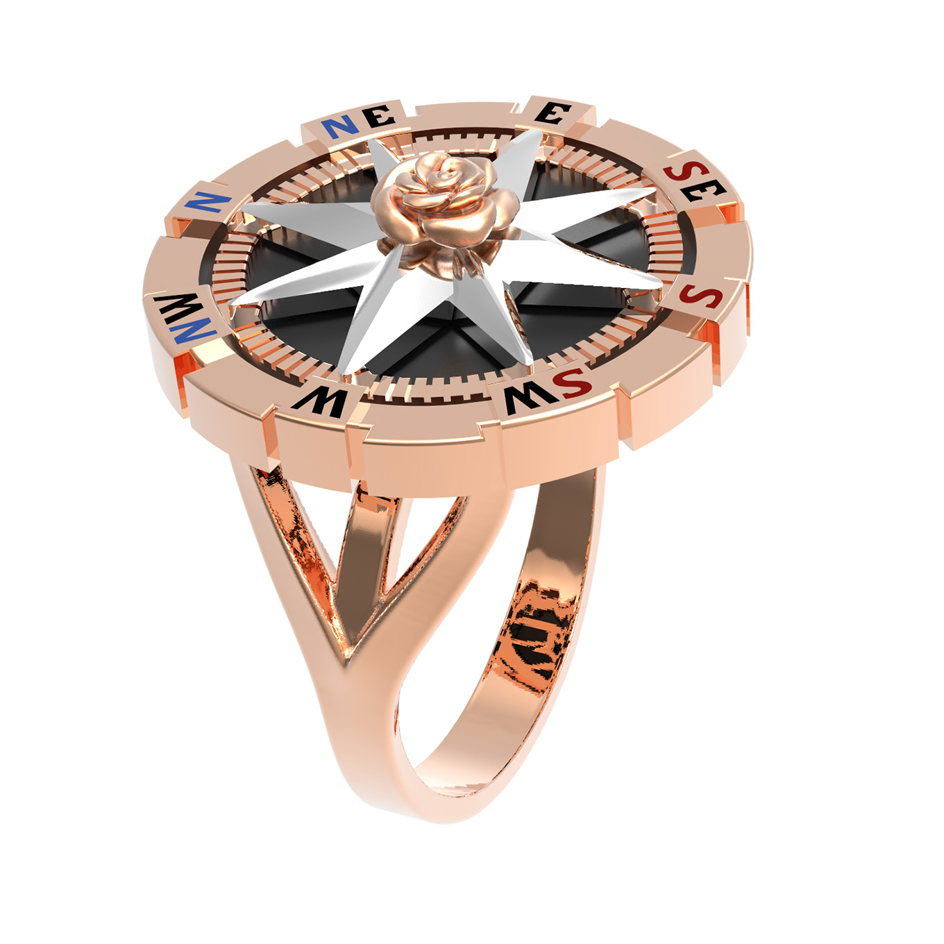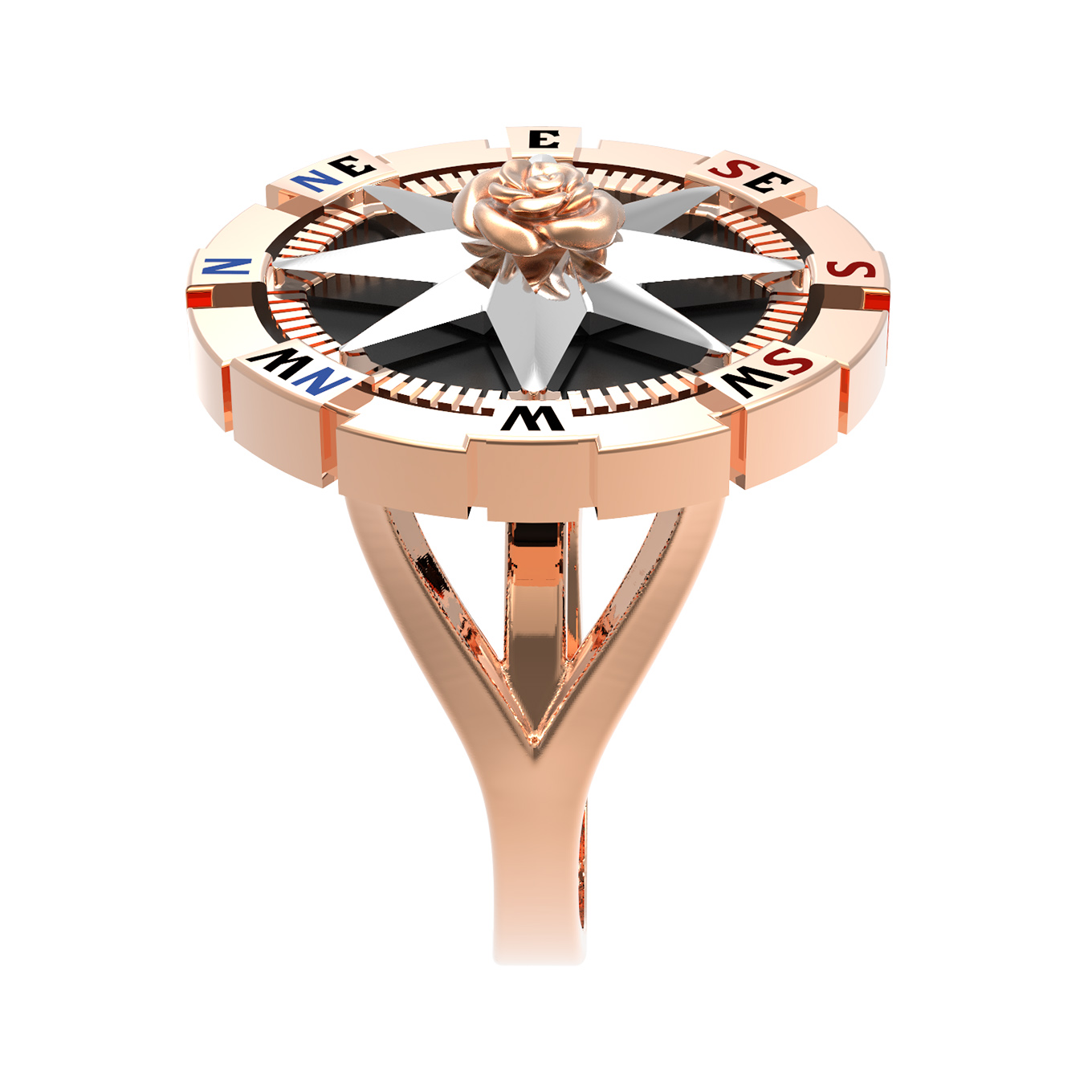 Дизайн кольца вдохновлен эстетикой морских путешествий и символикой розы ветров, что придает украшению глубокий смысл. Вставки из черного оникса круглой формы создают выразительный фон, подчеркивающий благородный блеск красного золота, а использование разноцветной эмали добавляет динамичные акценты. Данная модель универсальна в ношении и подходит как для женщин, так и для мужчин, подчеркивая индивидуальный стиль владельца.