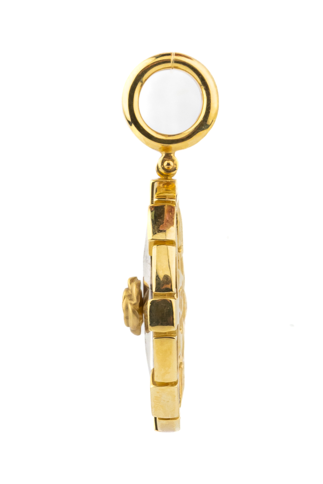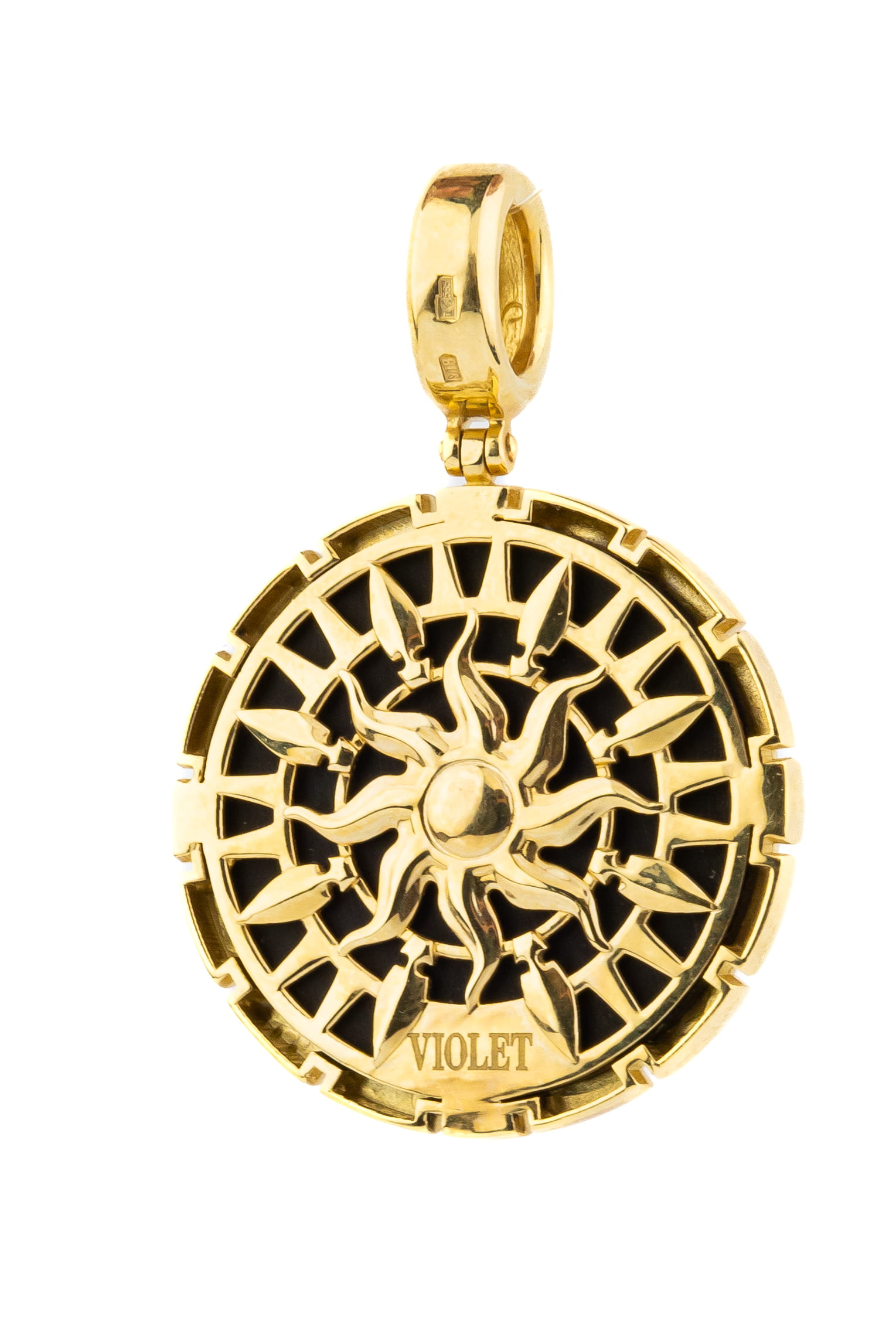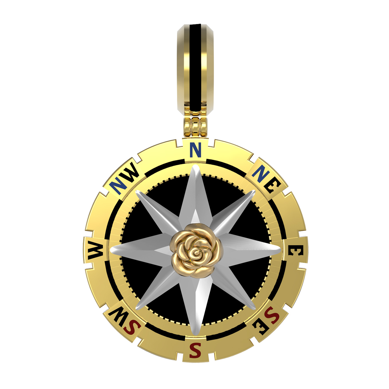 Особую выразительность аксессуару придает контрастное сочетание материалов. В основе декора лежит благородный черный оникс круглой формы, который эффектно гармонирует с ярким лимонным оттенком золота. Детализация выполнена с использованием цветной эмали, подчеркивающей стороны света, что придает украшению динамичный и современный вид. В центре композиции расположена одна вставка, акцентирующая внимание на мастерстве исполнения.