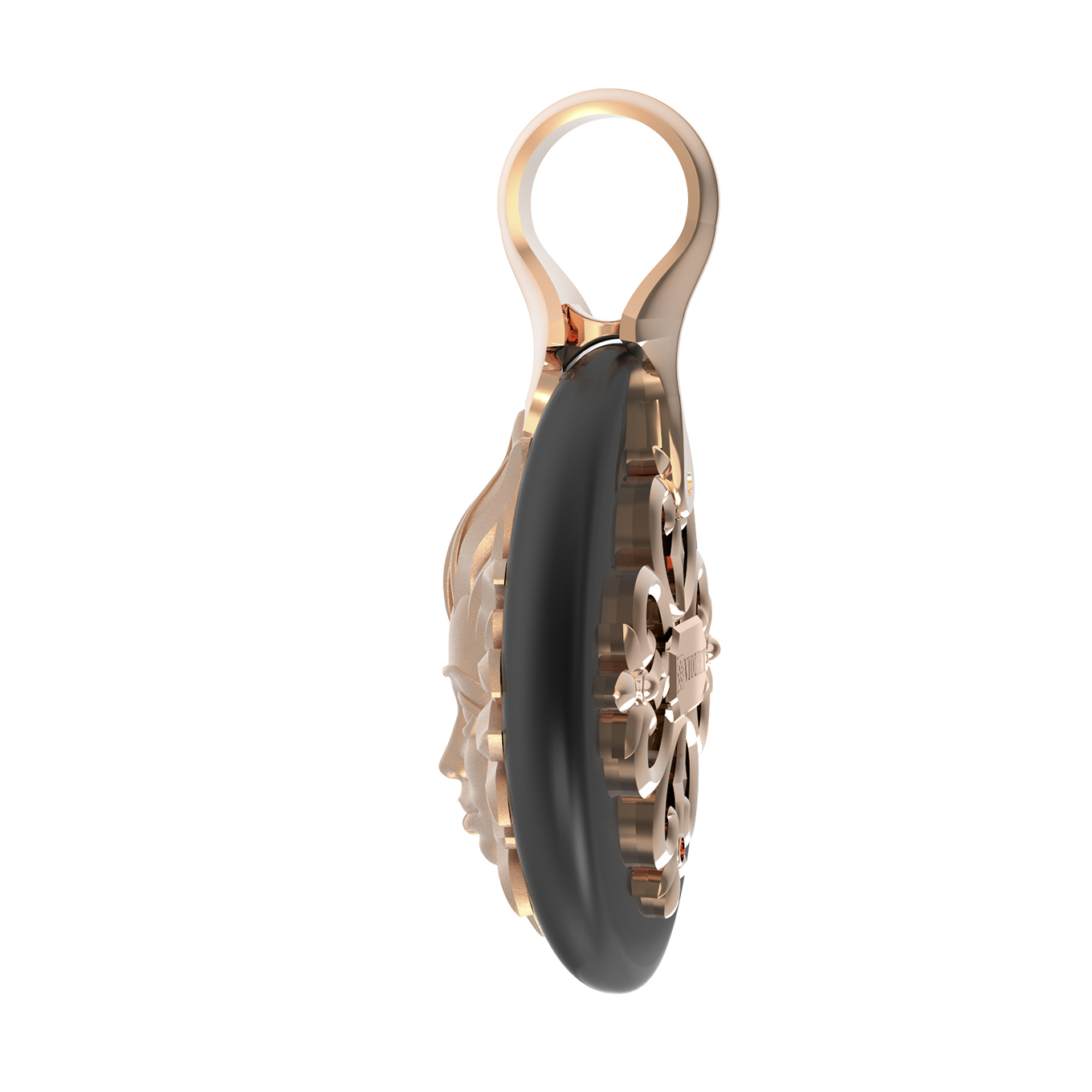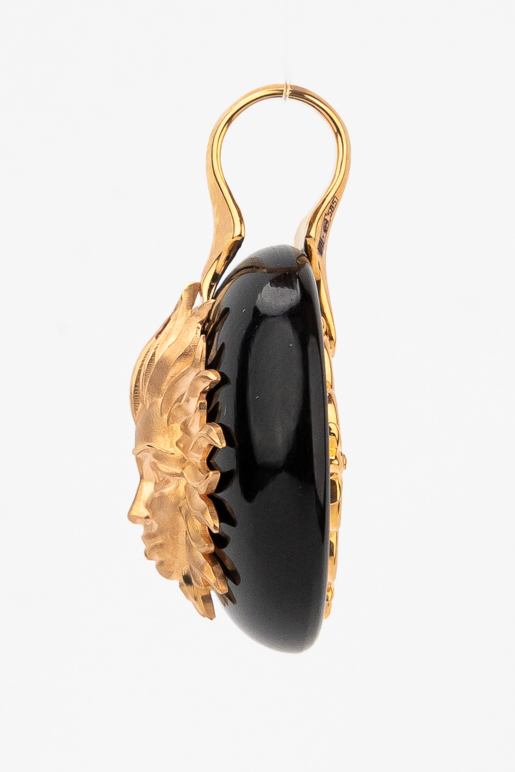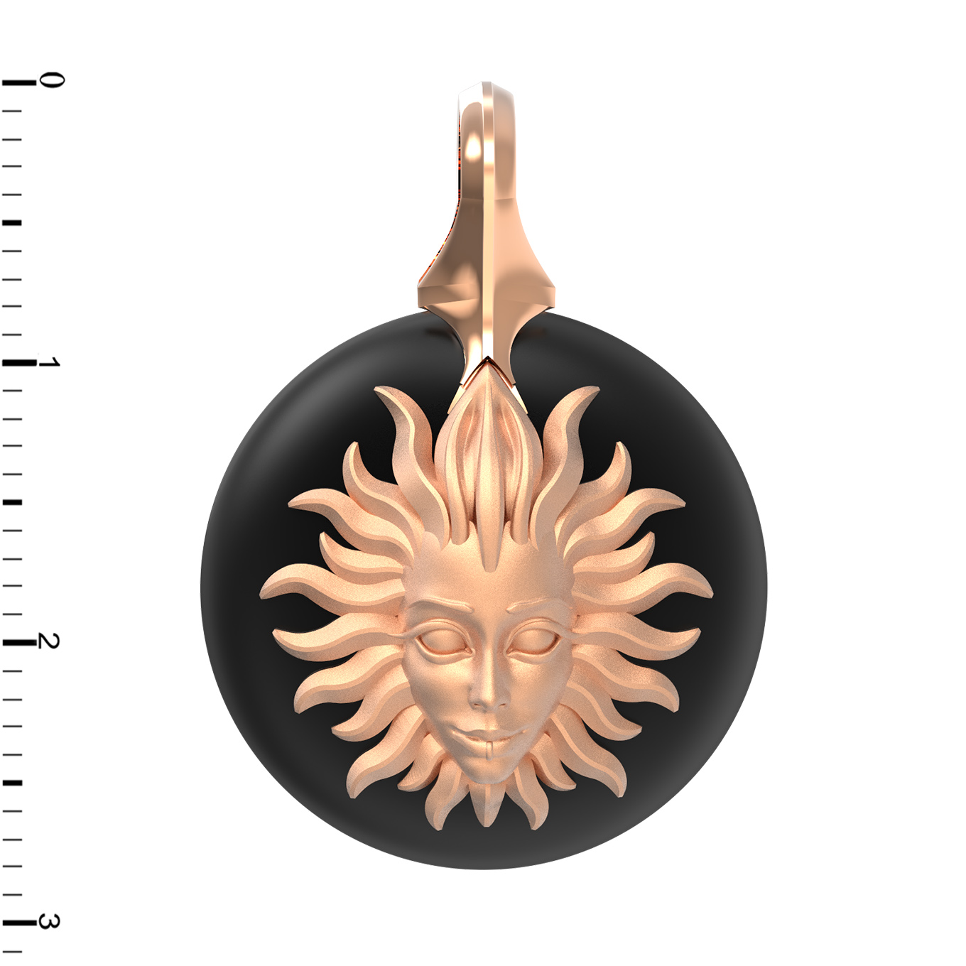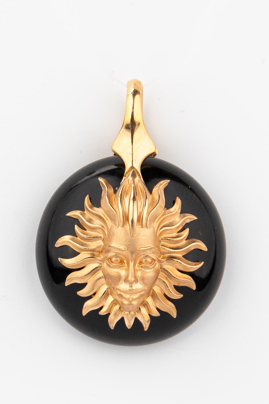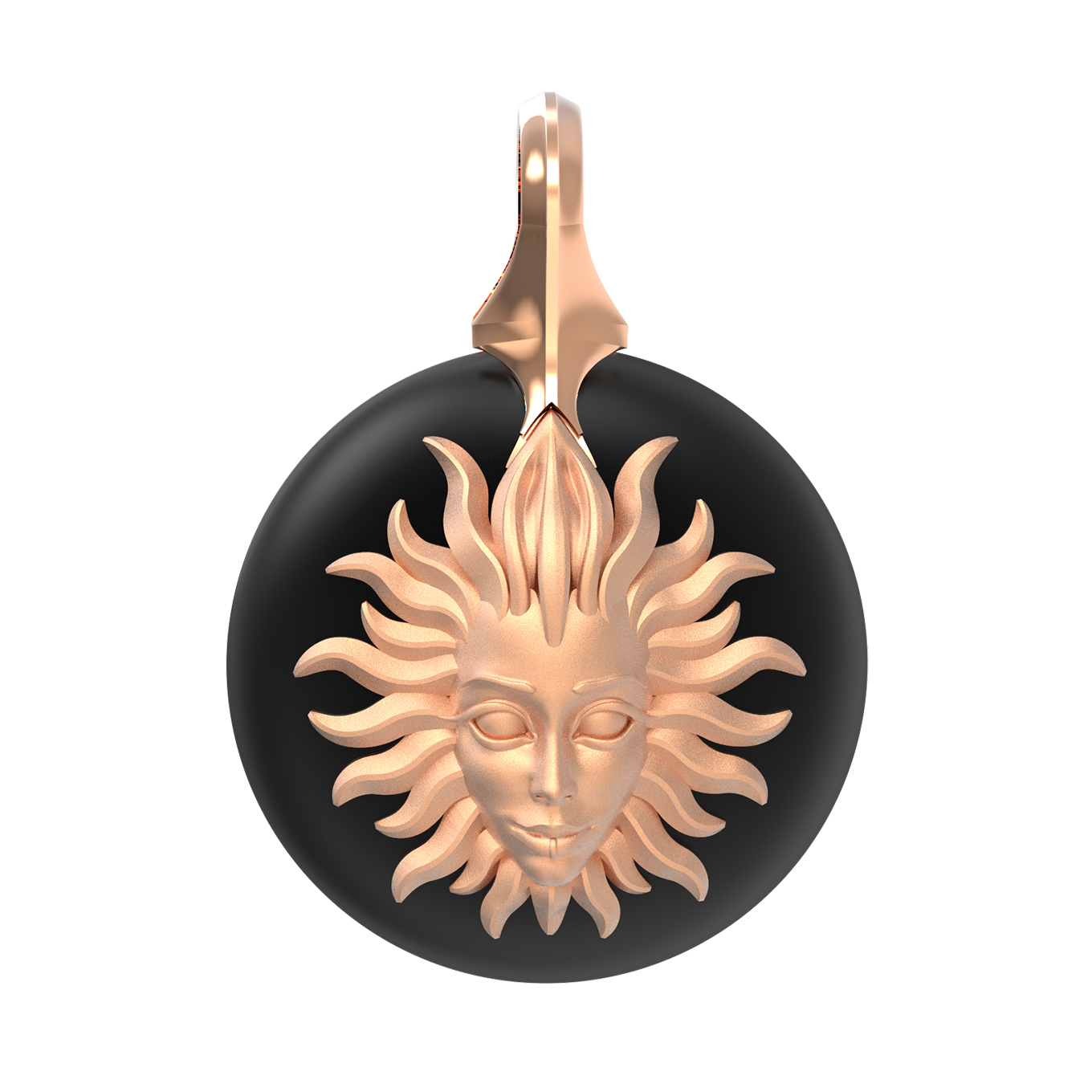 Центральным элементом композиции является изящный круглый оникс, на фоне которого расположено детально проработанное изображение солнца. Дизайн в стиле солнце/луна придает изделию философский подтекст, делая его выразительным акцентом вашего образа. Единственная вставка черного цвета гармонично сочетается с фактурным металлом, создавая запоминающийся визуальный эффект.