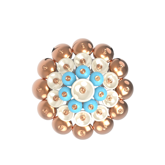 Центральный элемент композиции — семь вставок в форме бусин, выполненных из натуральной бирюзы бирюзового цвета и нежного перламутра. Сочетание теплых оттенков красного золота с прохладным сиянием камней создает выразительный контраст, привлекающий внимание к зоне декольте. Форма вставок в виде бусин придает украшению объем и динамику, позволяя ему эффектно играть на свету при каждом движении.