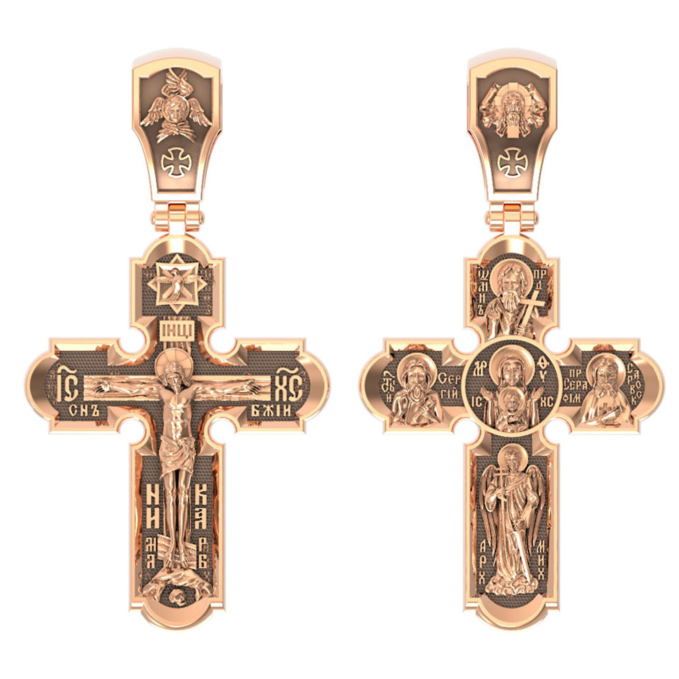 Центральную часть оборотной стороны креста украшает икона Божией Матери «Знамение». Иконы Божией Матери, известные под именем «Знамение», появились на Руси в XI — XII веках, а называться так стали после чудесного знамения от Новгородской иконы, случившегося в 1170 году. Многочисленные списки с иконы Знамения известны по всей России. На кресте внизу изображен Архангел Михаил, слева — Преподобный Сергий Радонежский, справа — Преподобный Серафим Саровский, вверху — Предтеча Господень Иоанн Креститель. На кулонном кольце помещено изображение Спаса Нерукотворного — образ Спасителя, который Он запечатлел на плате и передал для исцеления больному проказой царю Эдессы. Ему придается победное и защитное значение.