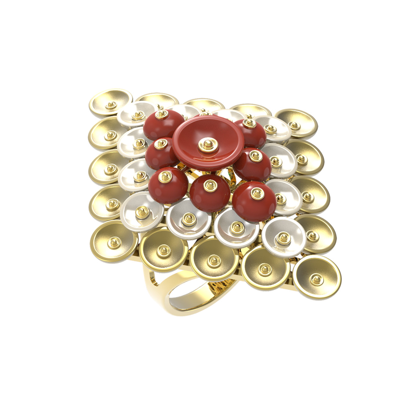 Центральным элементом композиции стали 9 вставок, выполненных в виде элегантных бусин. Контрастное сочетание красного агата и нежного перламутра создает неповторимую игру света и цвета, которая притягивает взгляд. Лимонный оттенок золота гармонично обрамляет вставки, добавляя изделию яркости и благородства. Геометрическая композиция из плоских и объемных элементов придает кольцу выразительный, современный вид.