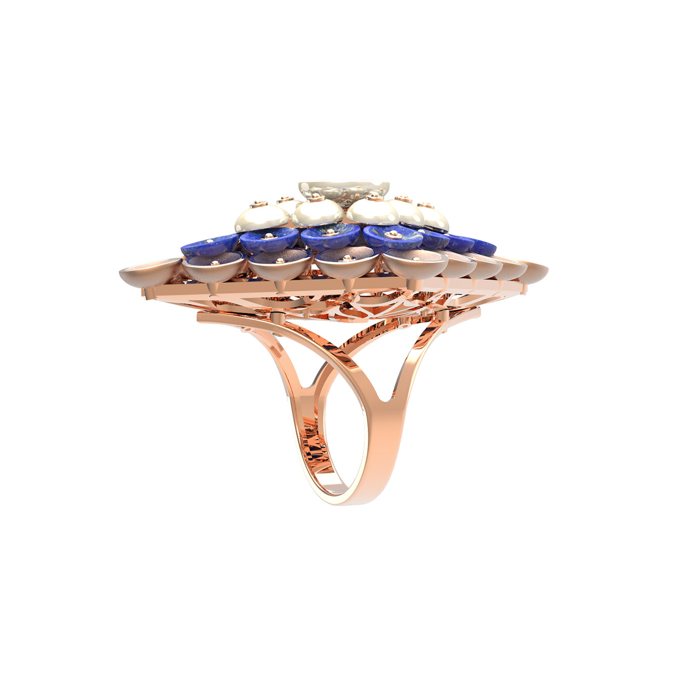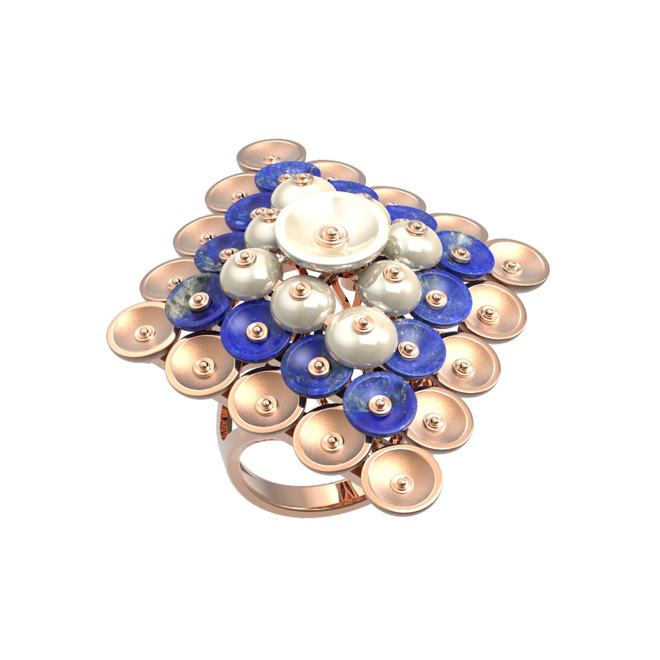 В оформлении кольца использовано 12 вставок: выразительный синий лазурит и нежный перламутр в форме бусин. Контраст глубокого, насыщенного цвета лазурита с мягким сиянием перламутра создает гармоничный дуэт, который эффектно подчеркивается теплым блеском красного золота. Ювелирная работа впечатляет своей детализацией — каждый элемент композиции выверен до мелочей.