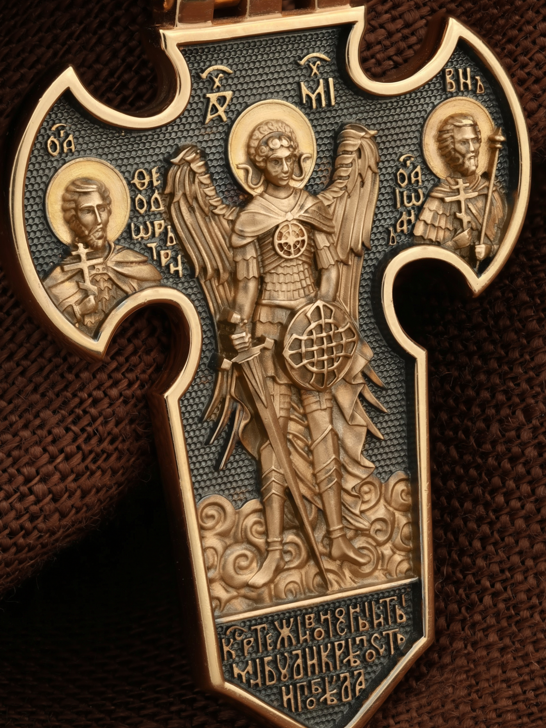 Оборот креста открывается величественной фигурой Архангела Михаила, архистратига Небесного воинства. Его имя означает «Кто яко Бог?», так как он самый могучий и грозный враг зла. С двух сторон от Архистратига Михаила предстоят еще два воина дружины Христовой: великомученик Феодор Тирон и мученик Иоанн Воин. В основании креста молитвенное обращение из Канона, написанного в XIV веке святым монахом Григорием Синаитом: «Кресте Живоносный, ты ми буди крепость и победа». Это молитва воина, восставшего против зла с любовью к ближнему, верой в Бога и надеждой на неизменную помощь Его Небесного Воинства.