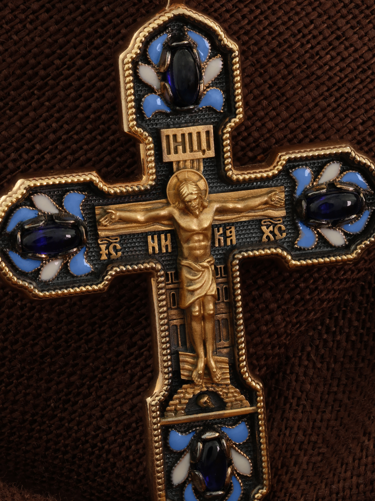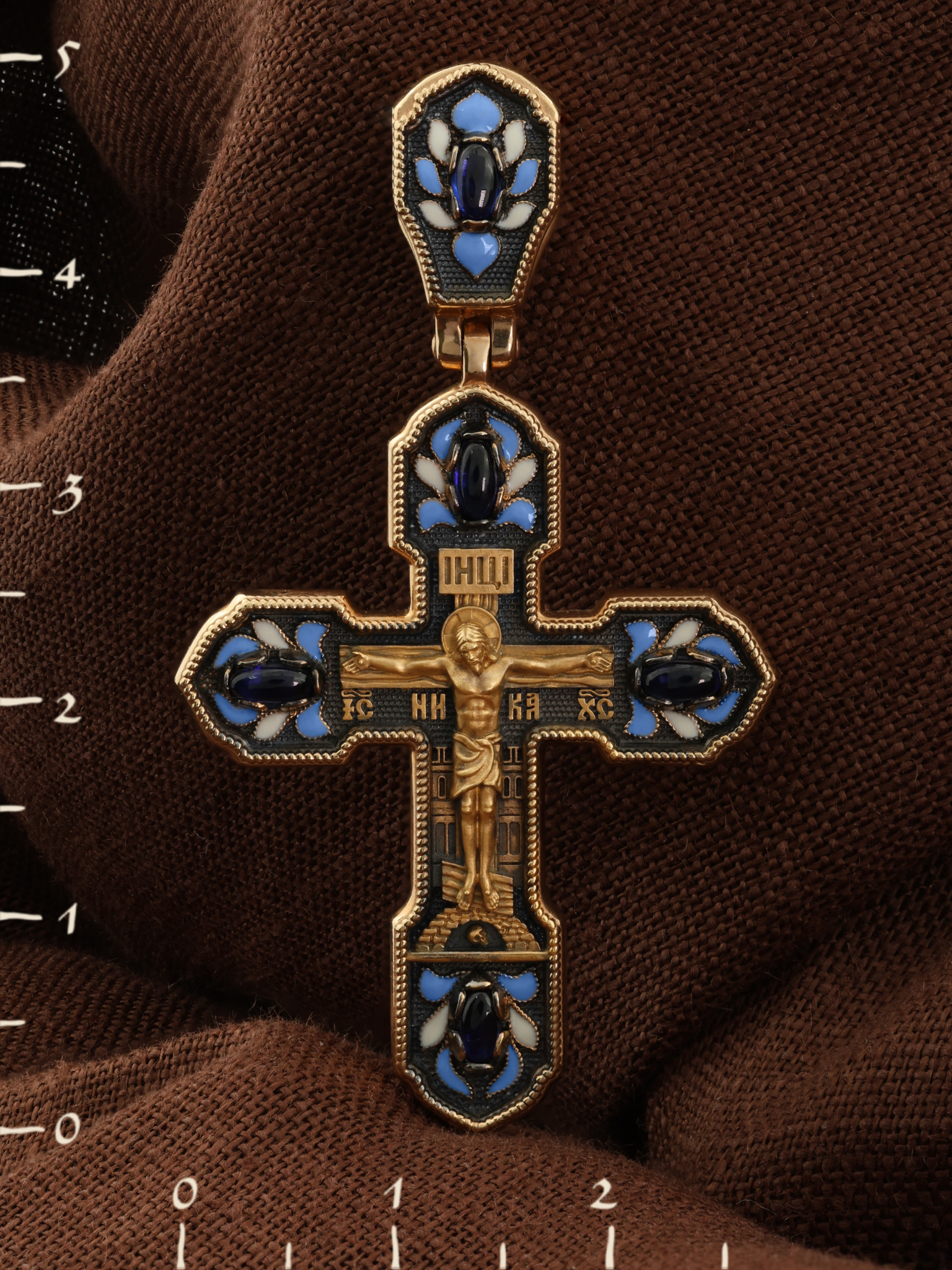 Крест из красного золота 585 пробы c эмалью и сапфиром