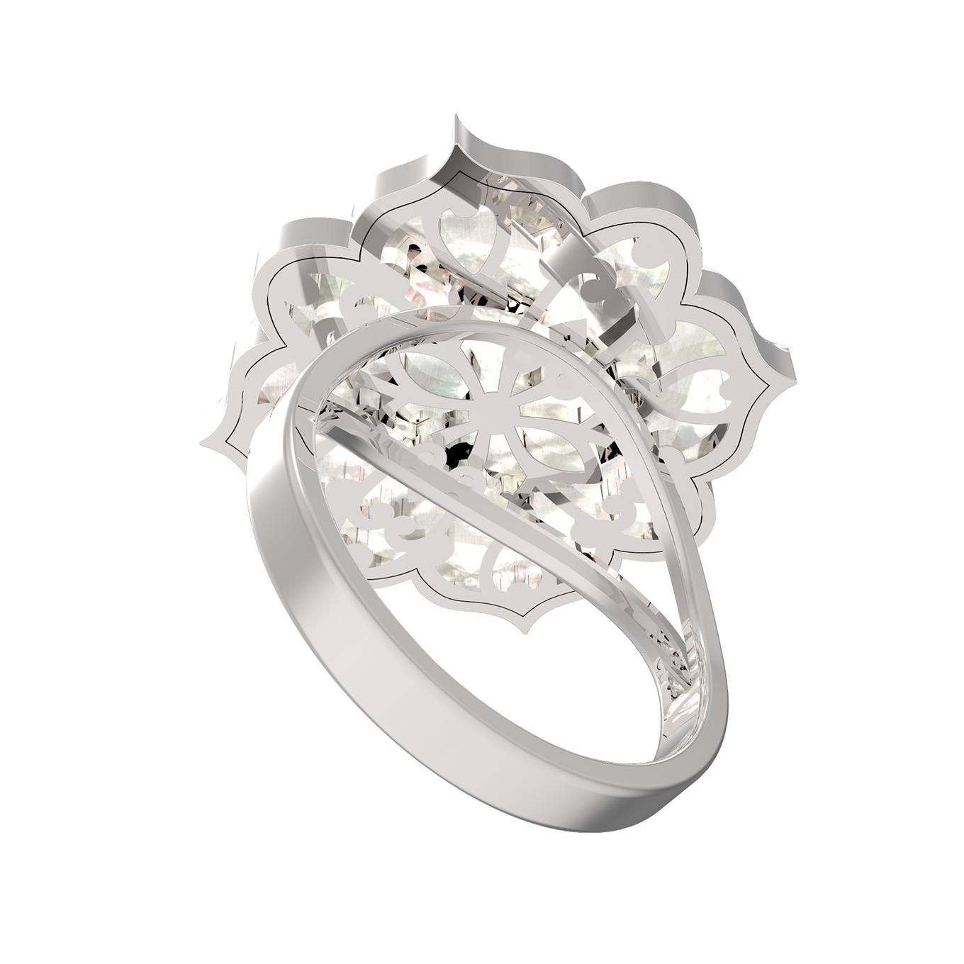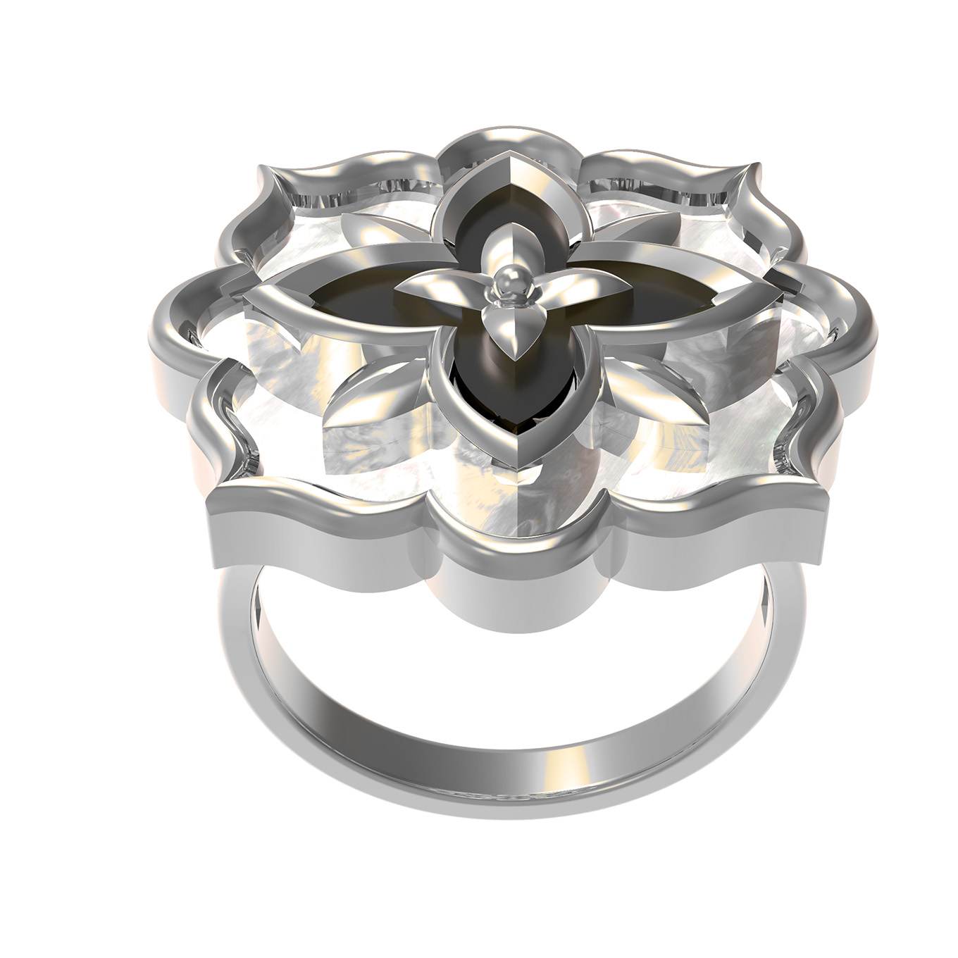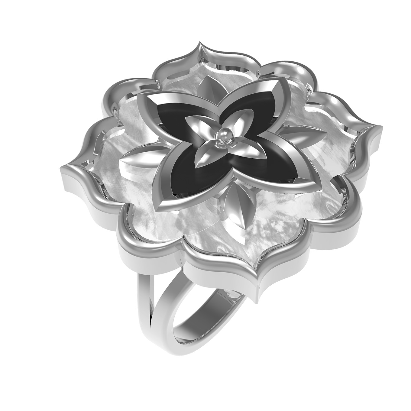 Кольцо из белого золота 585 пробы из коллекции De Luxe — Ренессанс станет утонченным акцентом в вашем образе. Дизайн изделия выполнен в стиле Ренессанс, где классическая строгость линий встречается с природной красотой материалов. Центральная часть кольца представляет собой изящный цветочный мотив, созданный гармоничным сочетанием черного оникса и нежного перламутра. Контраст глубокого черного цвета вставки и переливов перламутра придает украшению особую глубину и выразительность.