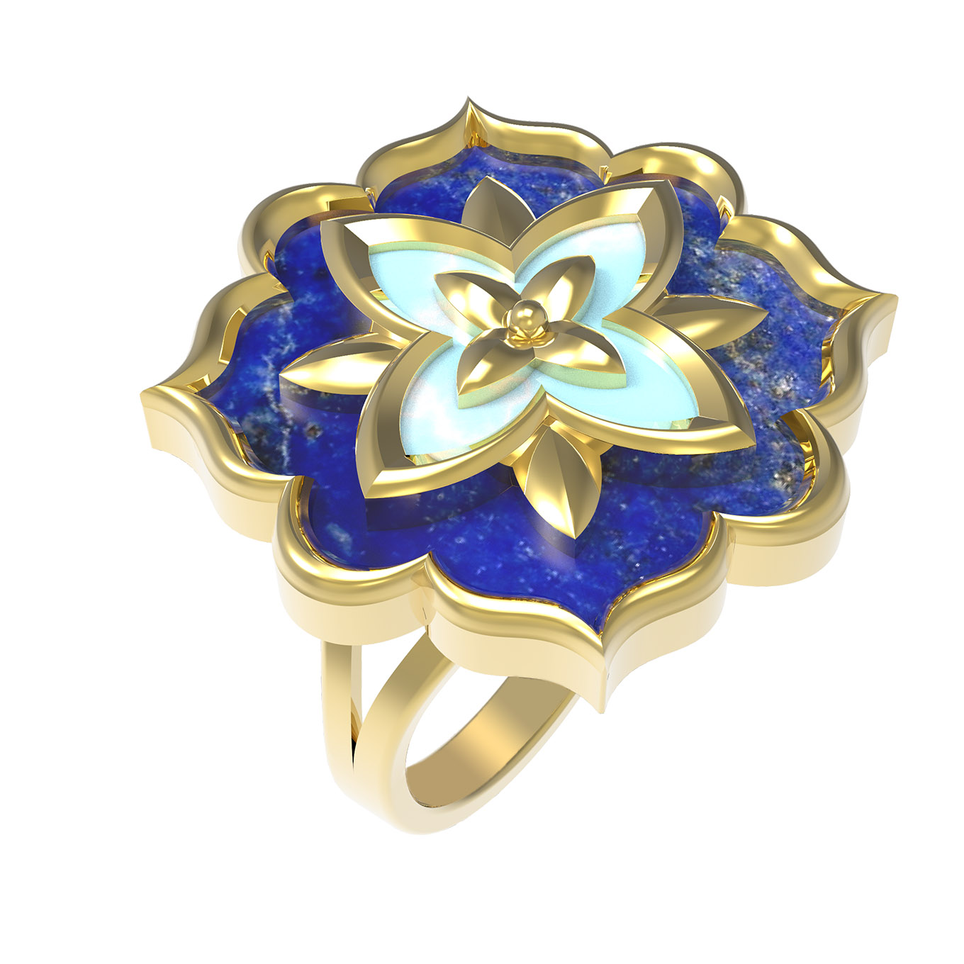 Роскошное кольцо из лимонного золота 585 пробы из коллекции De Luxe — Ренессанс воплощает в себе эстетику эпохи Ренессанс, переосмысленную в современном ювелирном прочтении. Дизайн изделия поражает своей детализацией: искусная форма цветка гармонично сочетает в себе благородный металл и природные минералы. В центре композиции расположены две вставки — нежная бирюза бирюзового цвета и глубокий синий лазурит, которые создают эффектный контраст и привлекают внимание к яркому, солнечному оттенку лимонного золота.