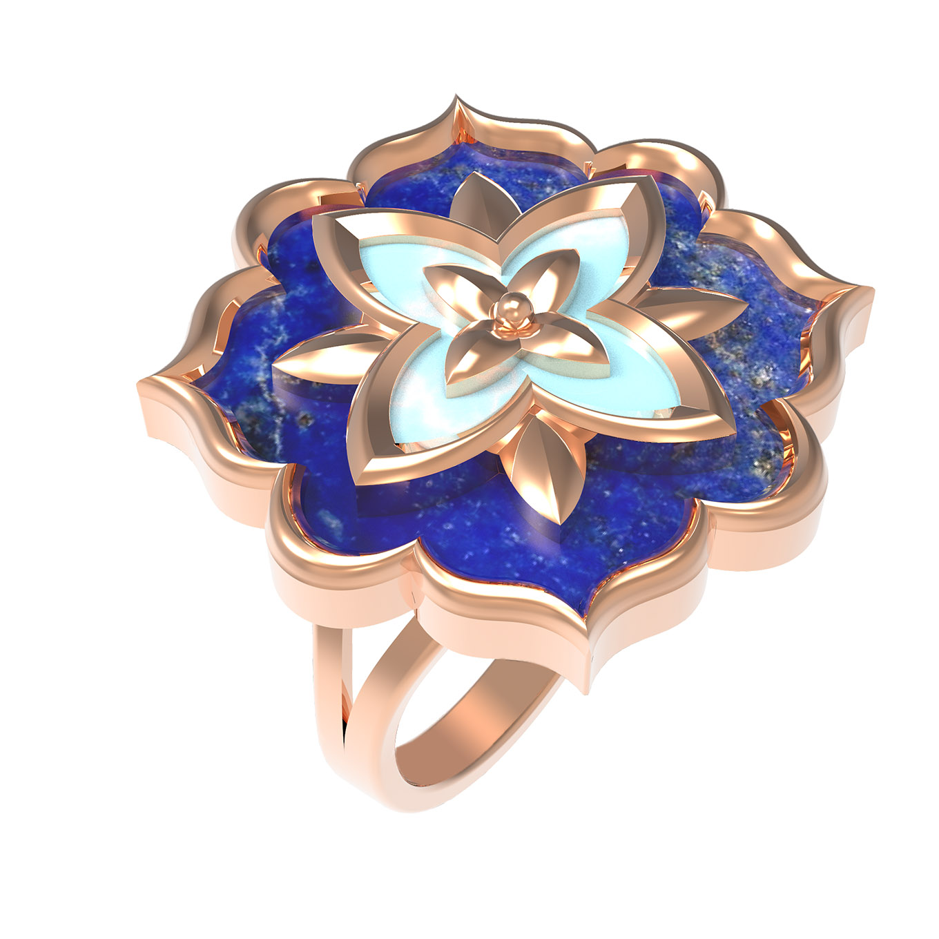 Кольцо из красного золота 585 пробы из коллекции De Luxe — Ренессанс станет изысканным акцентом вашего образа. Дизайн изделия вдохновлен эстетикой эпохи Ренессанс, где гармония форм и насыщенность цвета играют ключевую роль. Массивный декоративный элемент в виде распускающегося цветка приковывает взгляд своей многослойностью и контрастным сочетанием материалов. Центральная композиция дополнена вставками из бирюзы бирюзового цвета и глубокого синего лазурита, что создает благородный визуальный эффект.