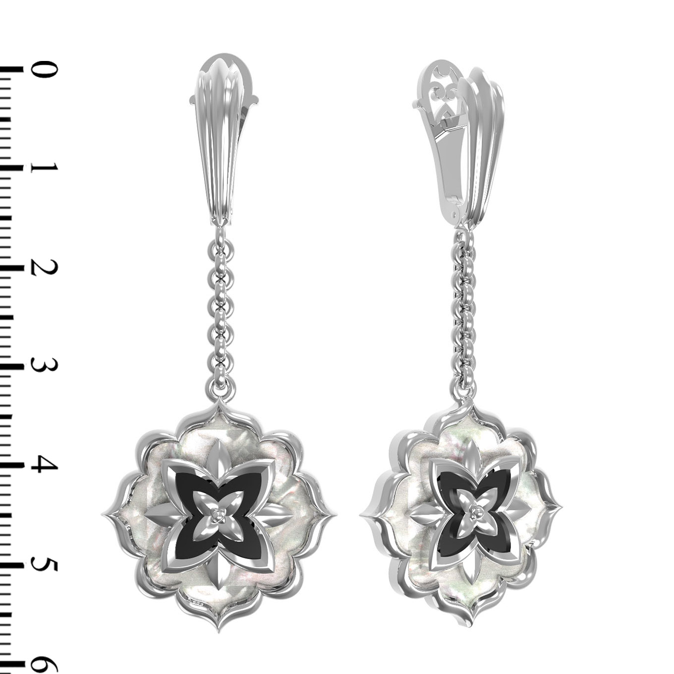 В центре композиции находится сочетание двух контрастных по фактуре камней: глубокого черного оникса и нежного перламутра. Именно этот дуэт придает серьгам статусное звучание. Дизайн Ренессанс прослеживается в филигранных линиях оправы, напоминающих старинные архитектурные элементы. Две вставки с перламутровым переливом и черным глянцем создают эффектный визуальный акцент.