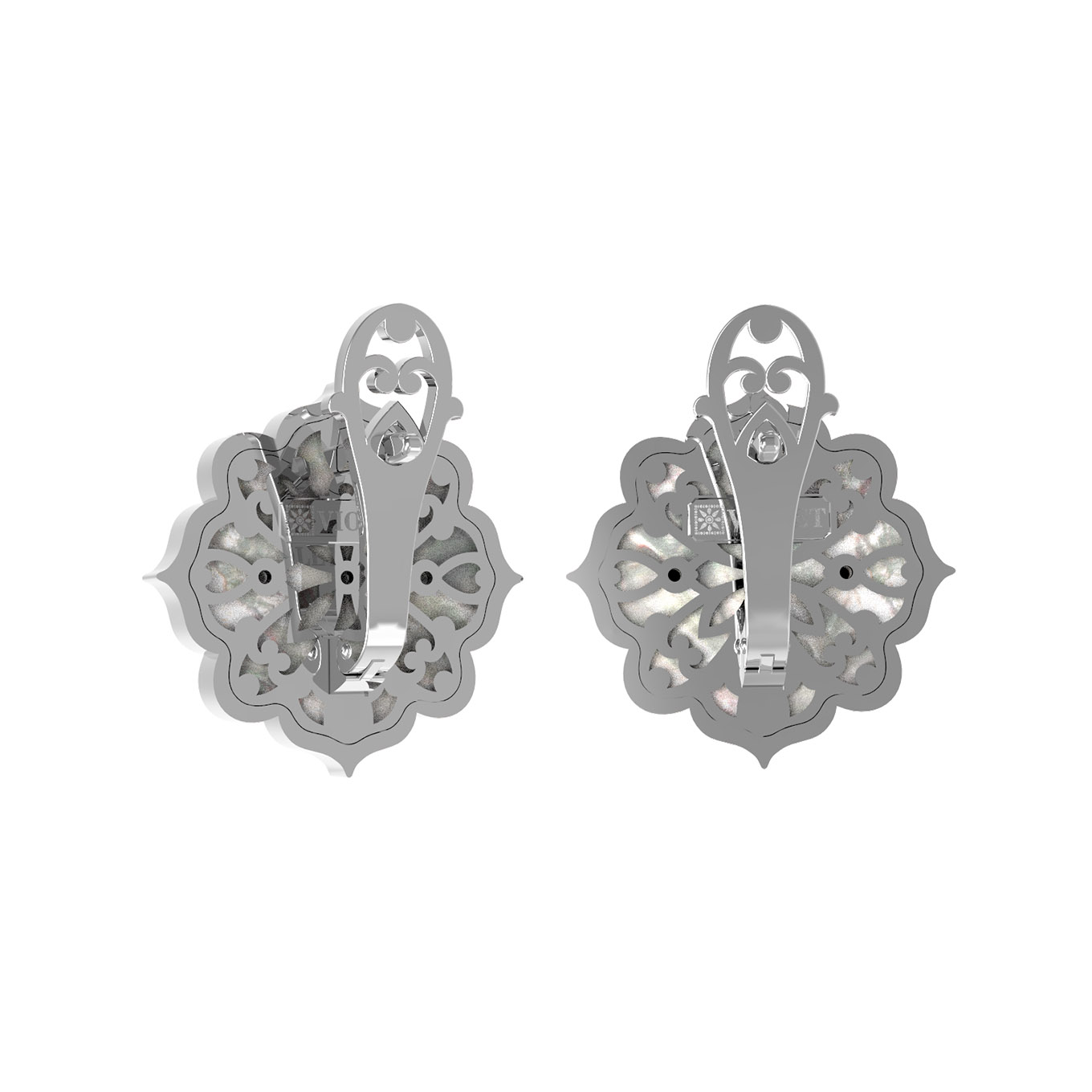 Центральным элементом композиции выступает искусное сочетание черного оникса и нежного перламутра. Две вставки, выполненные в виде стилизованного цветка с глубоким черным центром и перламутровым обрамлением, придают изделию особую выразительность. Геометрически выверенные линии оправы в духе эпохи Возрождения создают объемный и глубокий эффект, который подчеркивает статус владельца.