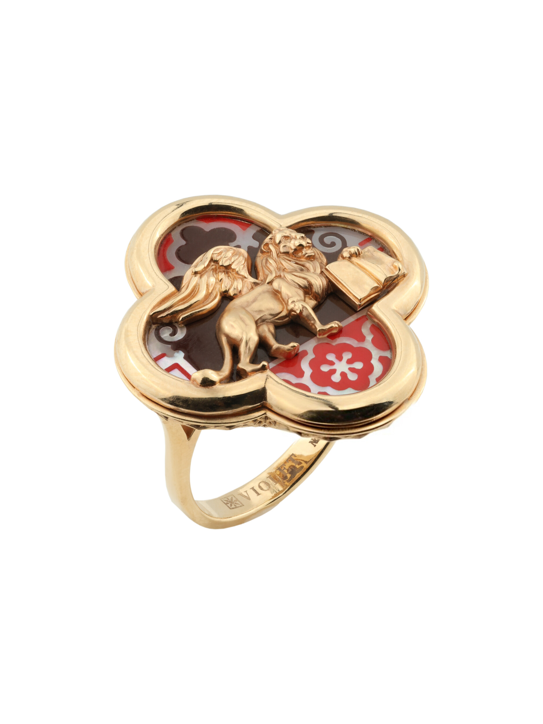 Особую художественную выразительность модели придает сочетание материалов: благородный блеск красного золота гармонично дополнен изысканными вставками из перламутра и разноцветной эмали. Эти детали создают неповторимый цветовой акцент, подчеркивая глубину и детальность дизайна с изображением льва. Такое украшение органично дополнит образ как женщины, так и мужчины, становясь яркой деталью индивидуального стиля.