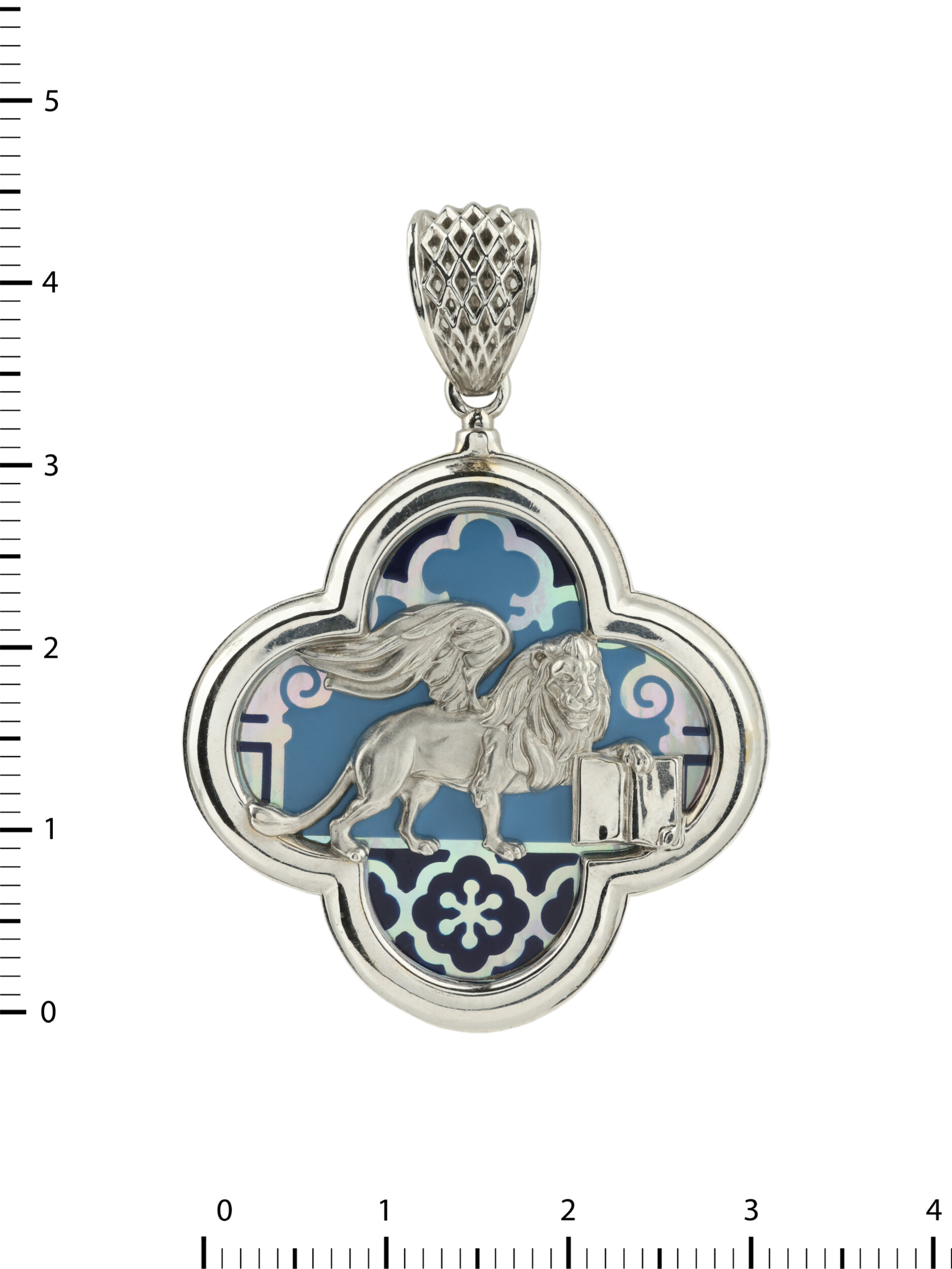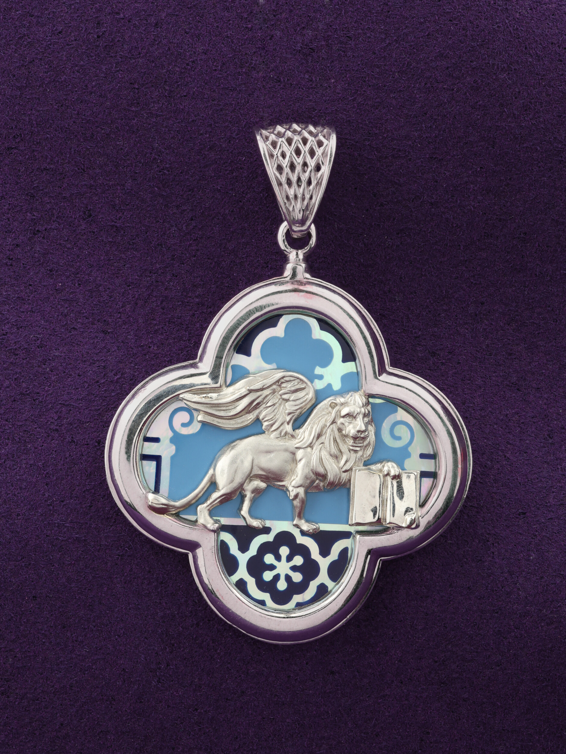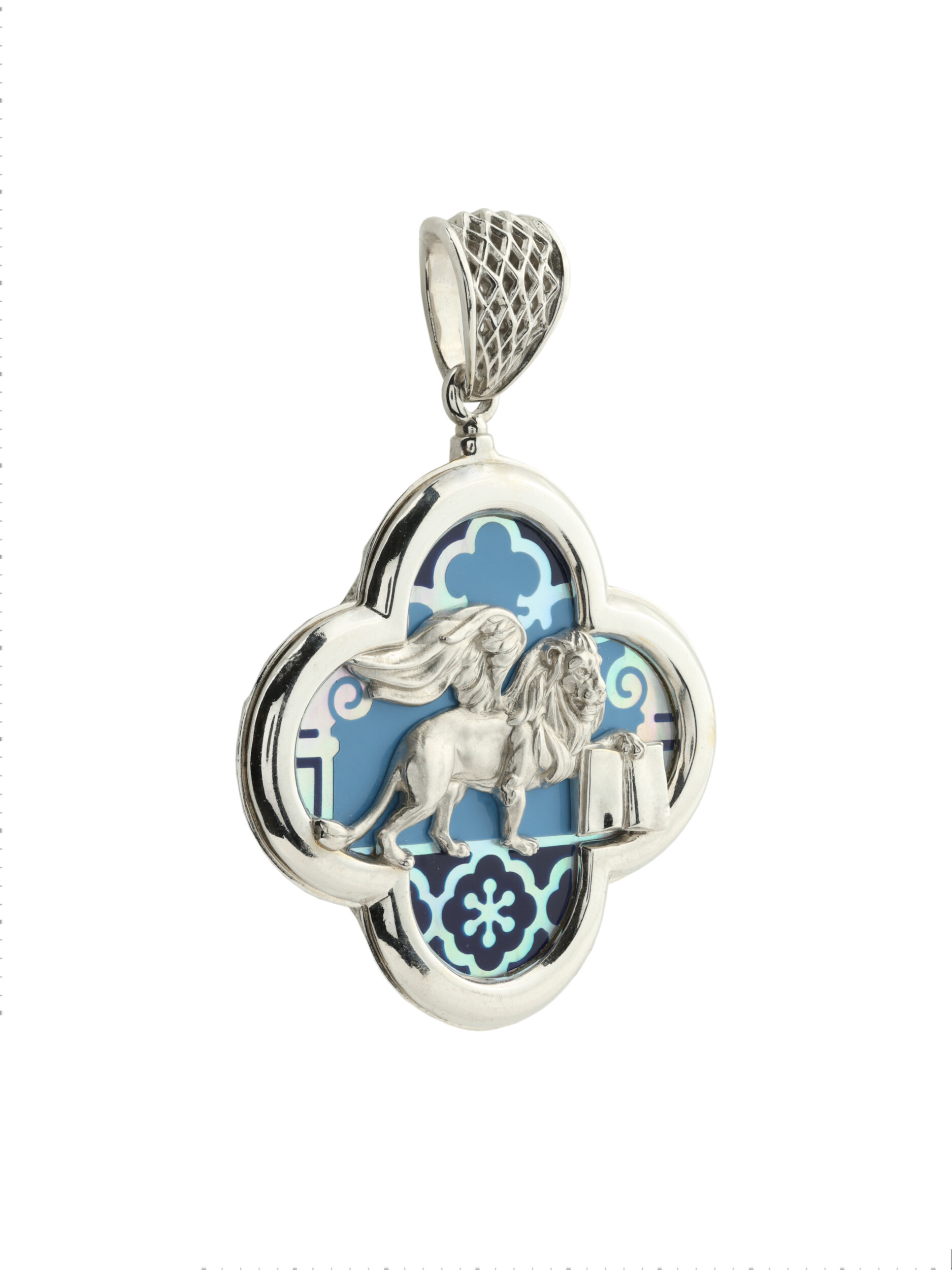 Подвеска из белого золота 585 пробы станет изысканным акцентом вашего образа. Дизайн украшения, выполненный в лучших традициях коллекции De luxe Premium — Венецианский лев, обращается к символике величественного льва — эмблемы силы и благородства. Центральным элементом композиции является искусная фигура льва, детально проработанная ювелирами, которая эффектно выделяется на фоне декоративной вставки из перламутра и разноцветной эмали. Холодный блеск белого металла гармонично дополняет утонченную игру переливов перламутра, создавая благородное сочетание, привлекающее внимание своей глубиной и художественным исполнением.