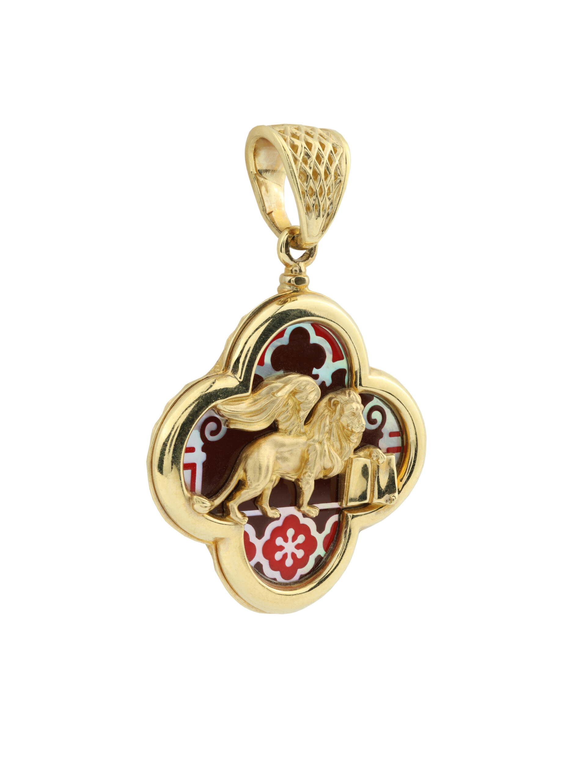 Роскошная подвеска из коллекции De luxe Premium — Венецианский лев станет воплощением вашего безупречного стиля и утонченного вкуса. Изделие выполнено из благородного лимонного золота 585 пробы, которое подчеркивает теплоту и ценность металла. Центральный элемент дизайна — величественный лев, чья фигура проработана с особой тщательностью, символизируя силу, мудрость и благородство. Этот художественный образ гармонично дополнен изысканными вставками из натурального перламутра и яркой разноцветной эмали, создающими неповторимый визуальный акцент.