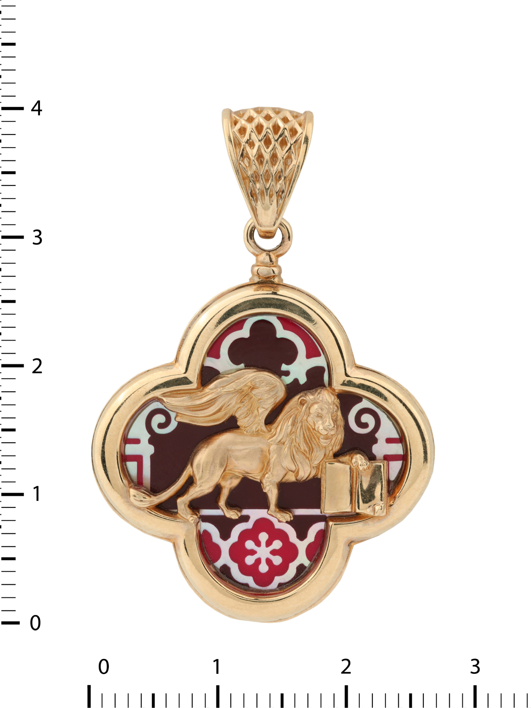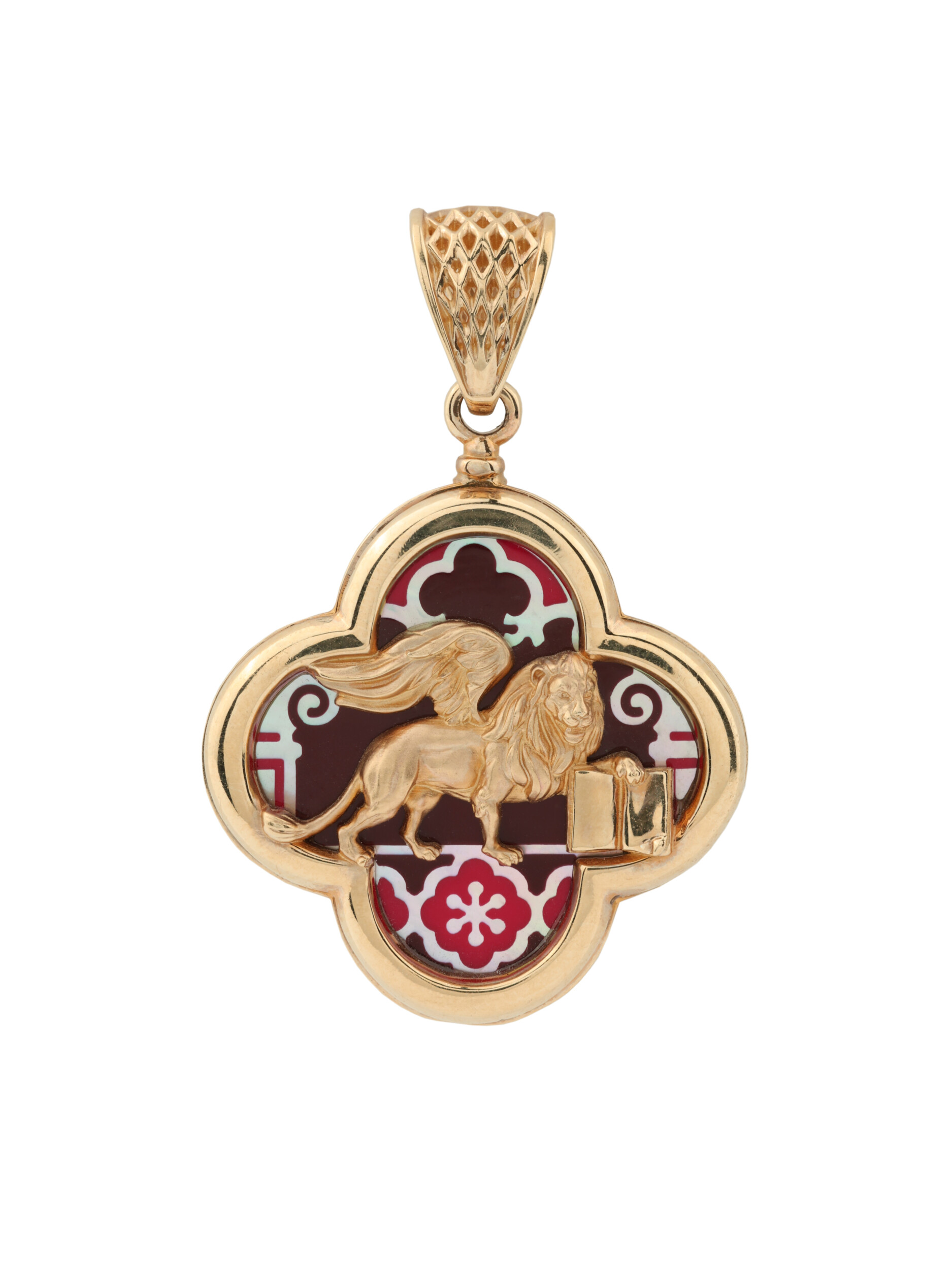 Подвеска из красного золота 585 пробы — яркий пример ювелирного искусства, вдохновленного символикой великой Венеции. Украшение входит в коллекцию De luxe Premium — Венецианский лев, центральным образом которой стали грациозные львы. Мастера воплотили в металле величественный силуэт крылатого льва, выполненного с филигранной точностью. Золотая фигура хищника эффектно контрастирует с декоративным фоном, где сочетаются ювелирная эмаль и натуральный перламутр. Разноцветная эмаль и переливающийся перламутр создают глубину и игру света, подчеркивая статус и художественную ценность изделия.