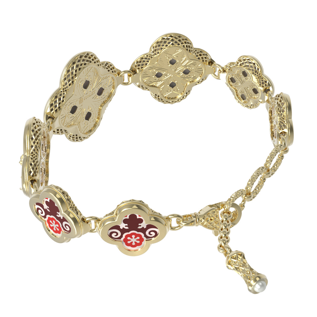 Особую художественную ценность браслету придает сочетание материалов. Теплый оттенок лимонного золота гармонично дополнен вставками из жемчуга, перламутра и разноцветной эмали. Декоративные элементы круглой формы создают изысканный визуальный ритм, а игра света на перламутровых поверхностях придает украшению магическое сияние. Белый цвет жемчуга в сочетании с яркой палитрой эмали превращает аксессуар в произведение высокого ювелирного искусства.