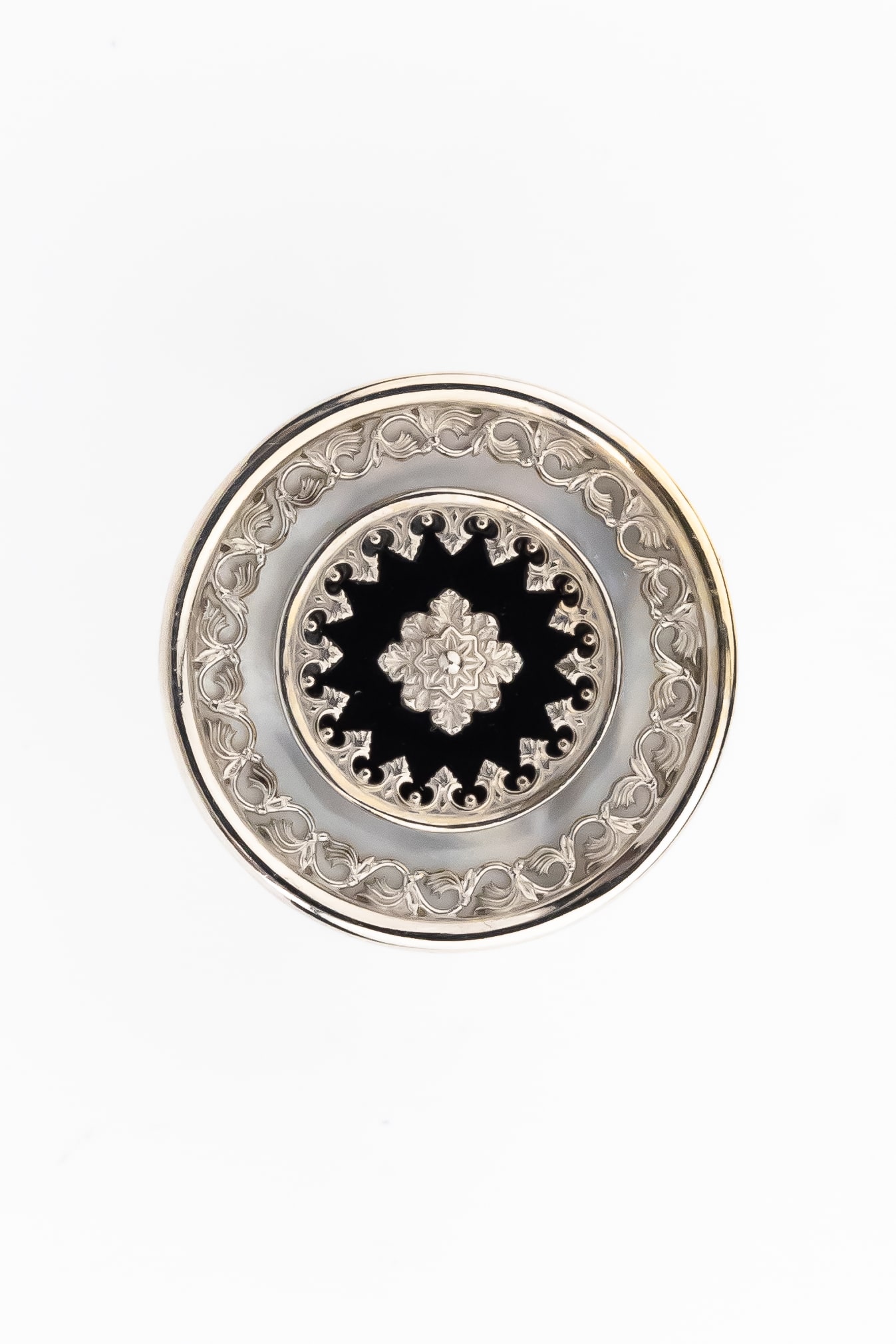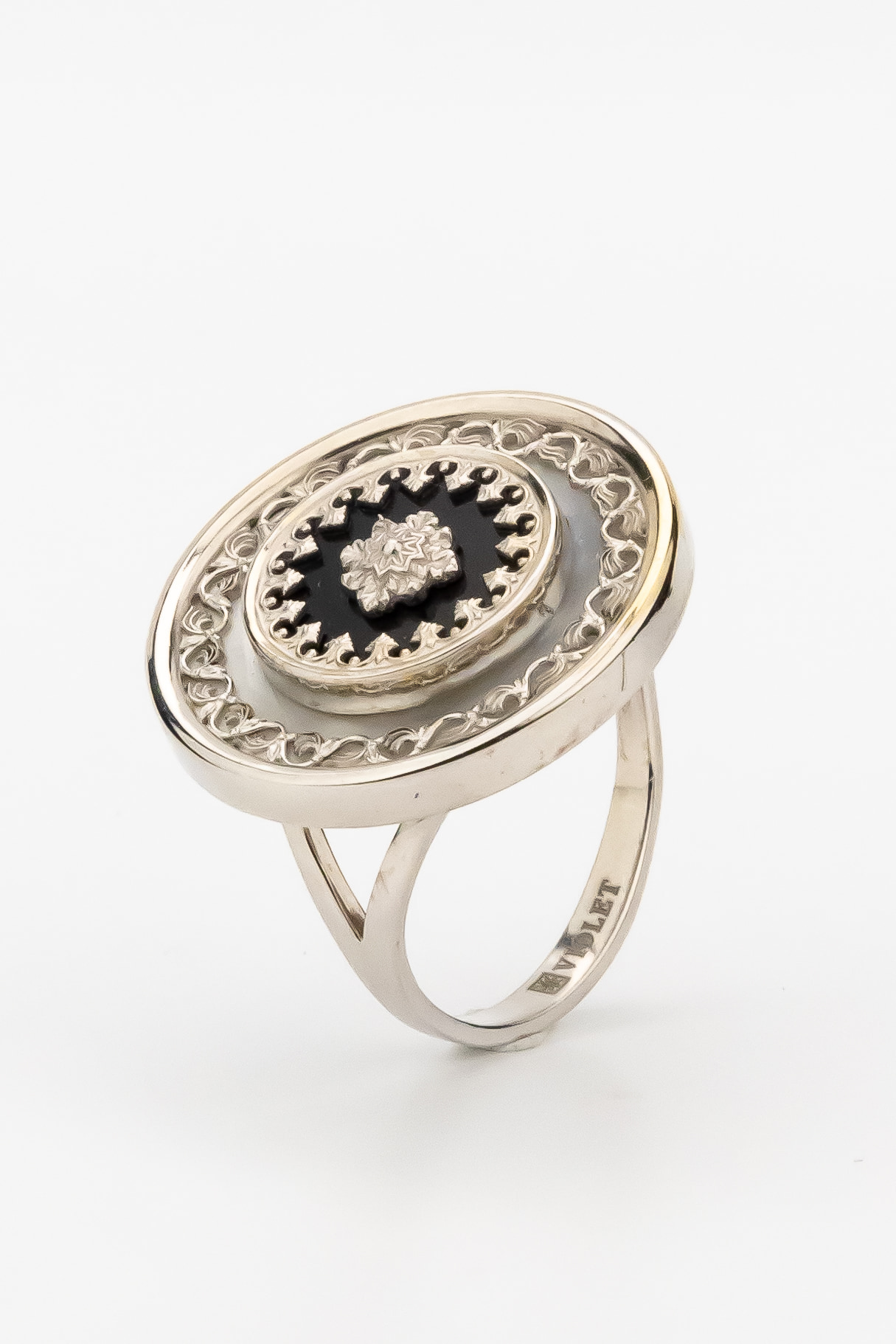 Кольцо из белого золота 585 пробы c ониксом и перламутром