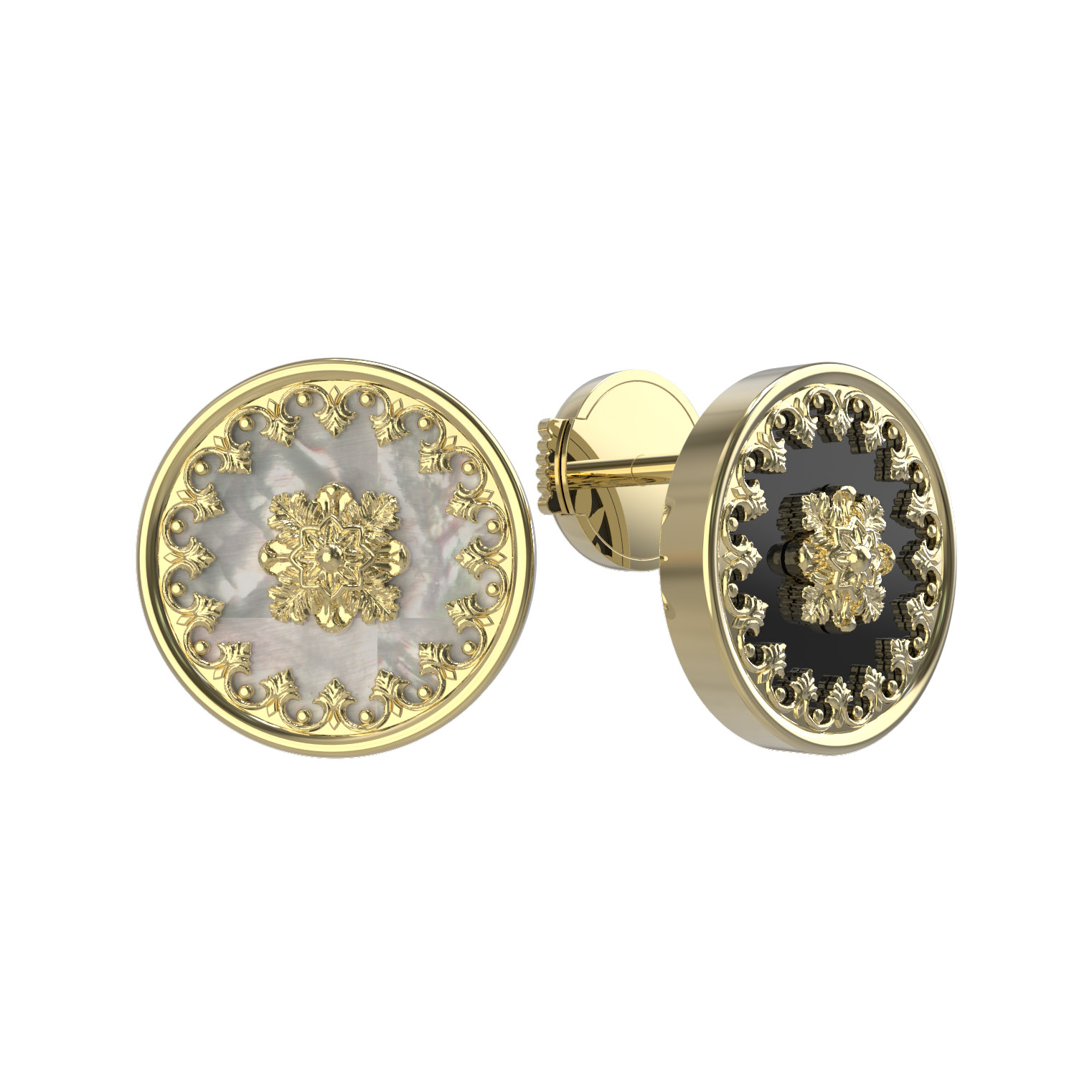 Центральным элементом композиции выступают вставки круглой формы: контрастное сочетание глубокого черного оникса и нежного переливчатого перламутра придает аксессуару особую выразительность и глубину. Дизайн изделия отличается симметрией и выраженными декоративными элементами, которые напоминают о классическом ювелирном искусстве. Общее количество вставок составляет 1 на каждое изделие, что делает акцент на качестве используемых материалов.