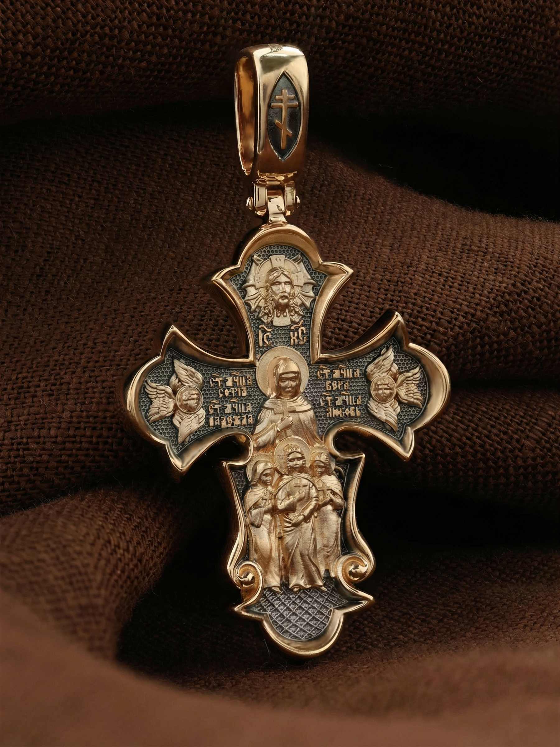 На оборотной стороне креста изображены Святые мученицы Вера, Надежда, Любовь и матерь их София, жившие во 2 веке нашей эры в Римской империи. Известно, что София была родом из Милана. Она рано овдовела, после чего перебралась в Рим. Своих дочерей София воспитывала в христианской вере и даже дала им имена в честь главных христианских добродетелей — Вера, Надежда и Любовь. В те годы римское государство жестоко преследовало верующих во Христа. Маленьких девочек (старшей Вере тогда было всего 12, а младшей Любови лишь 9) арестовали, подвергли истязаниям, а затем умертвили на глазах их матери. Сама София скончалась на следующий день у могилы своих дочерей. Но трагическая судьба на земле обернулась для мучениц вечной славой в ином мире. Церковь причислила их к лику святых и сегодня по молитвам к ним происходят чудеса. Выше образов мучениц изображен Спас Нерукотворный — образ Господа и Спасителя нашего Иисуса Христа, чудесно отпечатавшийся на плате, котором Христос вытер свой лик. По обеим сторонам креста изображены Ангелы Серафимы. На кулонном кольце помещен крест.