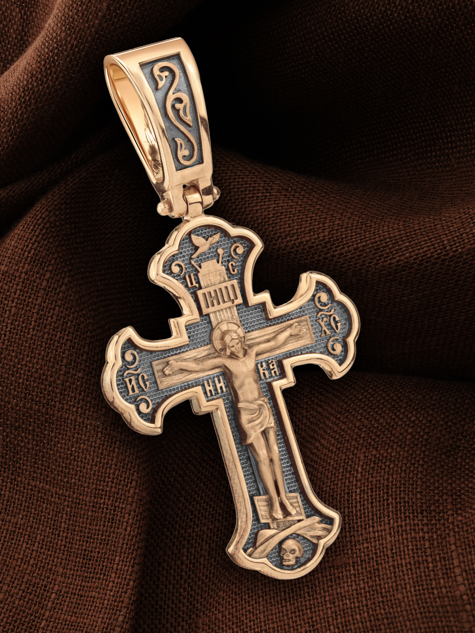 На лицевой стороне креста изображено Распятие, потому что это орудие казни Иисус Христос сделал орудием победы над грехом и смертью. Своими страданиями Он искупил грехи человечества, умерев и сошествовав во ад, победил сатану, освободил души праведников от вечной смерти и открыл им небесные врата рая. Жертва Христа сделала возможным спасение для каждого человека. На православном кресте Христос не умирает, а свободно простирает руки, ладони Иисуса открыты, будто он хочет обнять все человечество, даря им свою любовь и открывая путь к вечной жизни.
