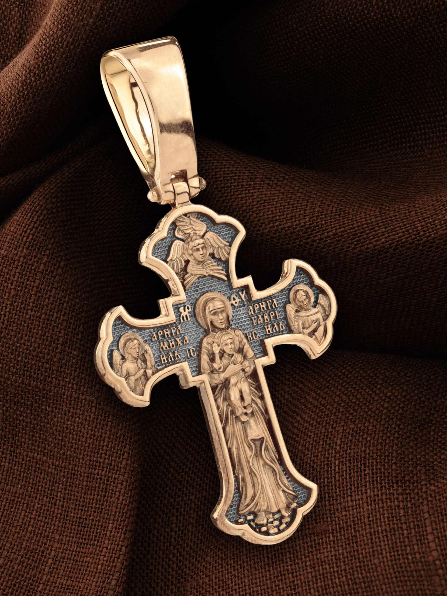 На обратной стороне креста в полный рост изображена Валаамская икона Божией Матери, над которой раскрыл свои крылья серафим. Этот образ написал в 1878 году иеромонах Валаамского монастыря о. Алипий. Валаамскую икону прославили многие чудеса, ее считают целительницей при разных недугах. Перед этим образом Богородицу молят в первую очередь об укреплении веры, просят даровать смирение, твердость в соблюдении заповедей Христовых и об исцелении. Богородице предстоят два архангела, Михаил и Гавриил.