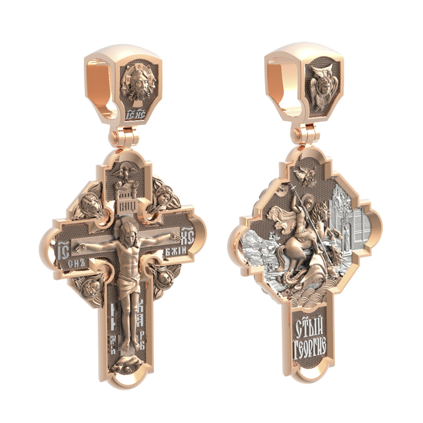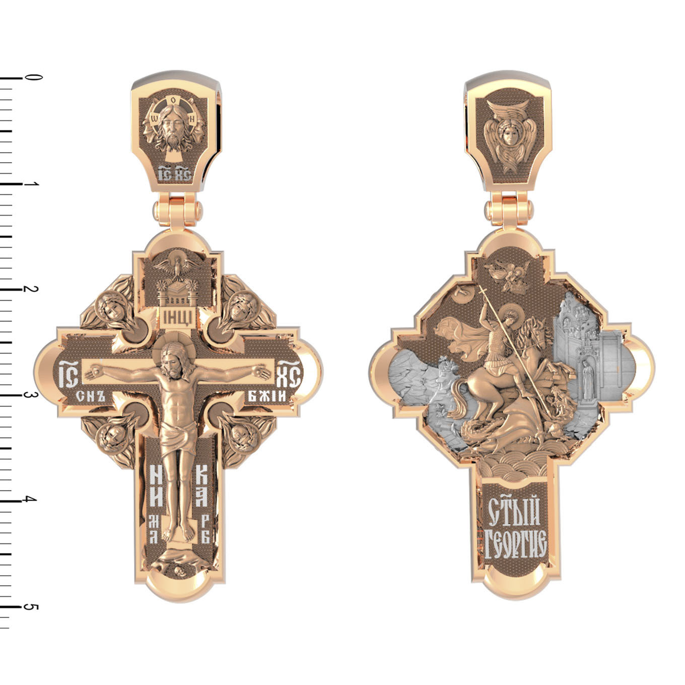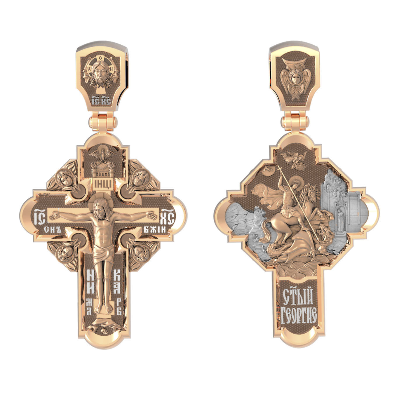 На оборотной стороне креста помещено изображение Святого Великомученика Георгия Победоносца — одного из самых почитаемых и удивительных святых. Георгий родился в Каппадокии (Малая Азия) в семье богатых и знатных горожан. Юношей поступил на службу к римскому императору Диоклетиану, за отличное знание военного дела и проявленную в боях и походах храбрость был приближен к императору и удостоен высокого воинского звания. Во время начавшихся гонений на христиан, перешел на сторону гонимых и, отвергнув человеческий страх, стал ярым проповедником учения Христа. Мучители подвергли опального воеводу жесточайшим восьмидневным пыткам и казнили его (обезглавили) в возрасте около тридцати лет в 303 году. Георгий изображен как воитель, сидящий на вздыбленном коне и поражающий копьем огнедышащего змея. Слева над образом изображена благословляющая Божия десница. Над святым изображен ангел возлагающий на него венец мученика. Змей символизирует собою сатанинские силы. Молитвами вознесенными к Всевышнему и своей непреклонной верой он смог одолеть чудовище. Святой убил змея, спас царскую дочь, принесенную в жертву, и жителей города, их души от влияния дьявола, породив в них надежду и веру в Господа, призывая людей принять христианскую веру. На кулонном кольце изображен шестикрылый Ангел — Серафим.